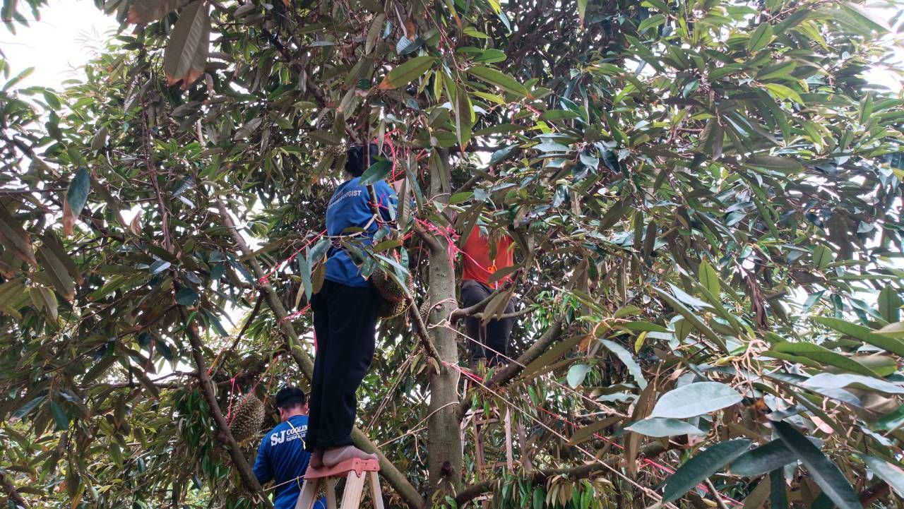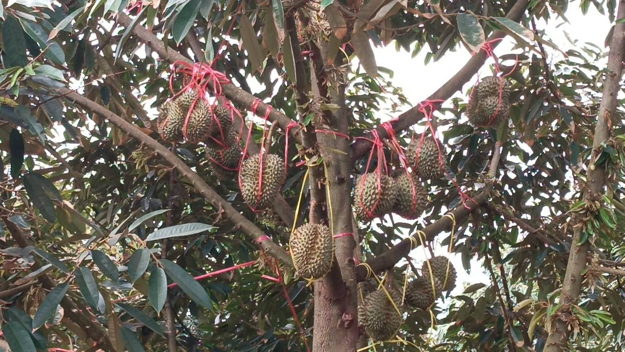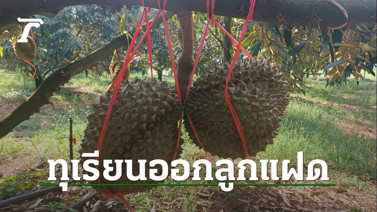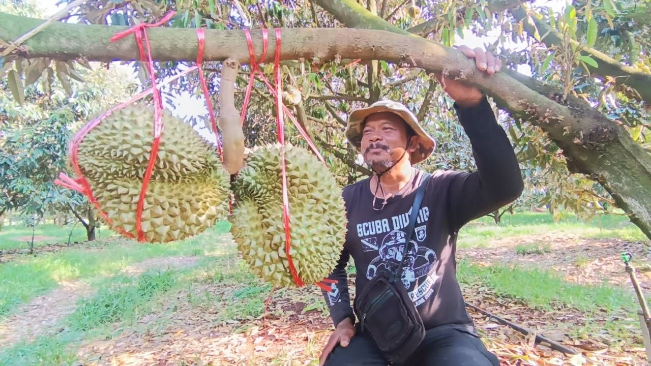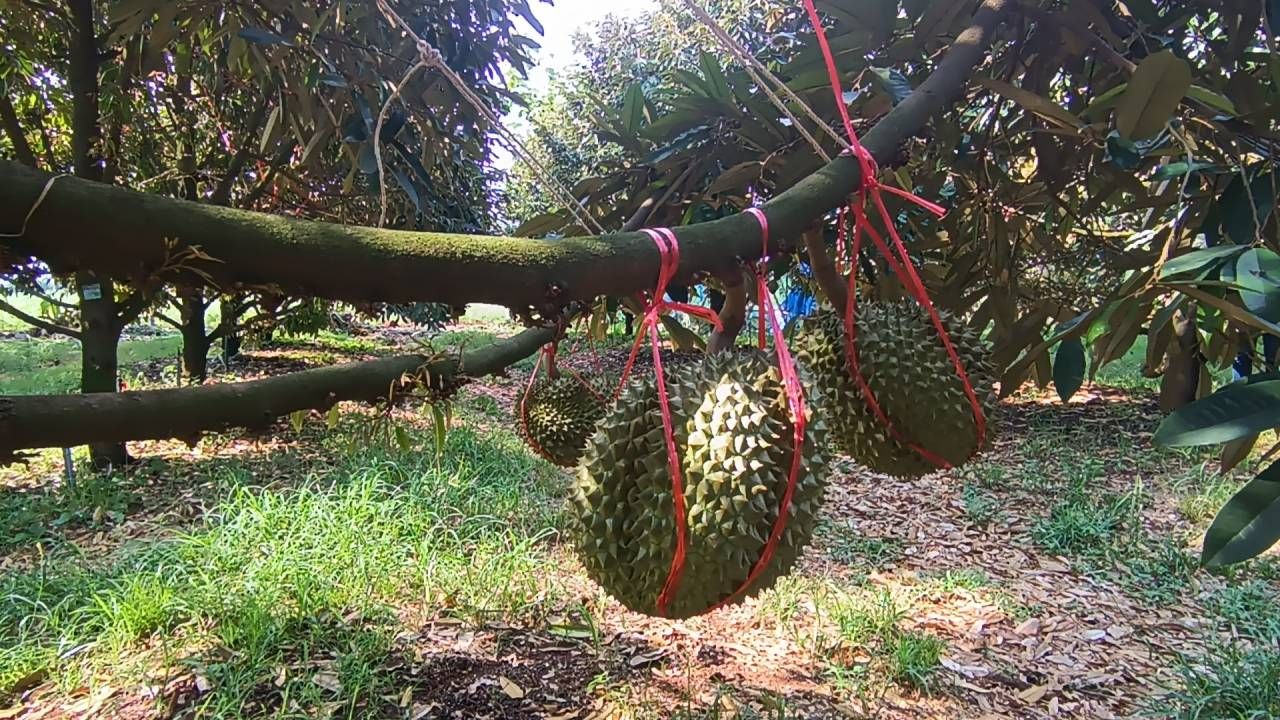 สวนทุเรียนลุงหนวดโคราช โชว์ต้นทุเรียนติดลูกแฝด ขั้วเดียว 2 ลูก น้ำหนักก็เท่ากันลูกละ 3-4 กก. ซึ่งปกติทุเรียนจะสลัดทิ้งเหลือลูกเดียว ขณะที่ผลผลิตปีนี้เจ้าของสวนแฮปปี้ ได้ผลผลิตเพิ่มกว่าเท่าตัว