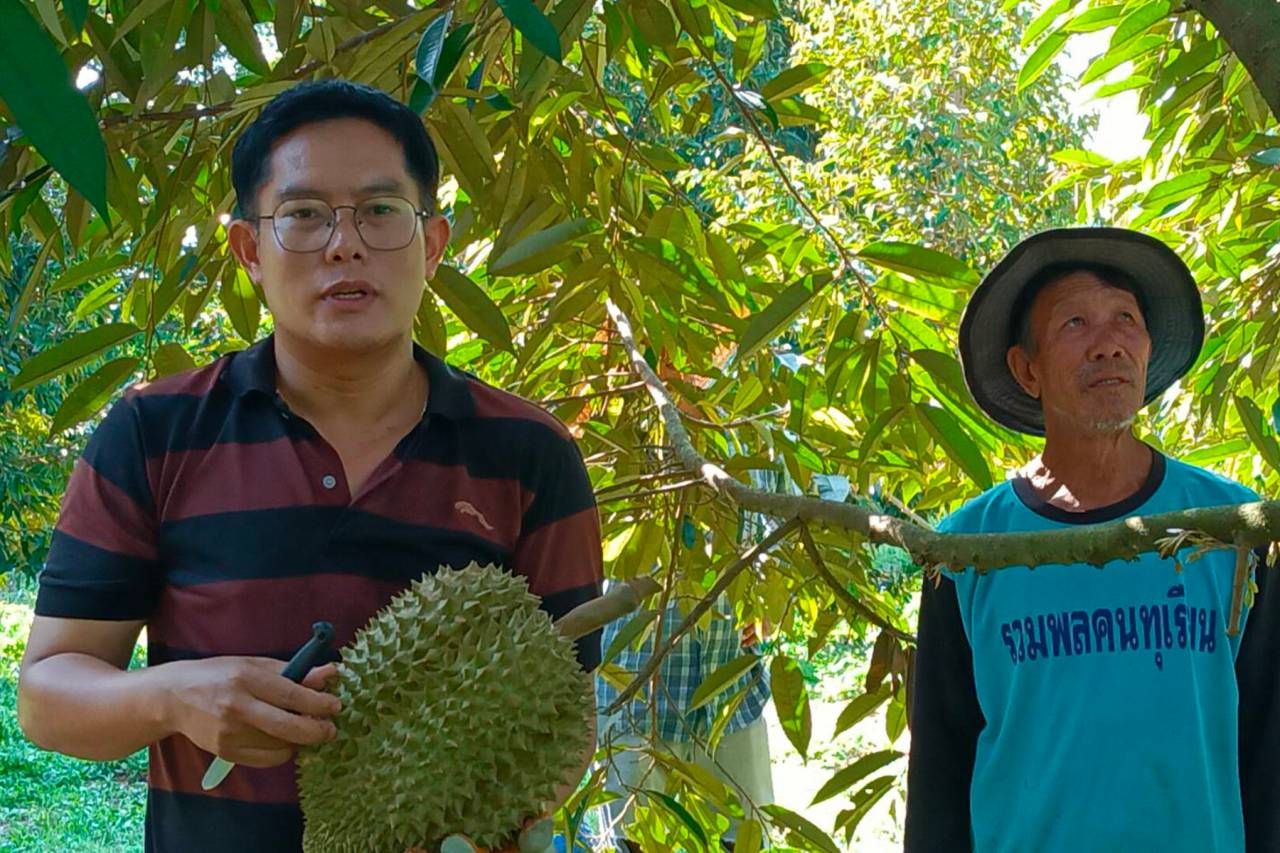 นายสุทธิกร หิรัญประสาทกุล เจ้าของสวนทุเรียน กล่าวว่า ได้ปลูกทุเรียนเข้าปีที่ 7 เน้นให้น้ำและใส่ปุ๋ยคอก (ปุ๋ยขี้วัวเป็นหลัก) สาเหตุที่สวนทุเรียนแปลงใหญ่นี้ได้ผลผลิตดี มาจากมีแหล่งน้ำที่เพียงพอ จึงสามารถให้น้ำวันละ 30-40 นาที ประกอบกับการใช้ปุ๋ยคอก (ปุ๋ยขี้วัวเป็นหลัก) จนขณะนี้ทุเรียนได้ติดดอกออกลูกมากขึ้น