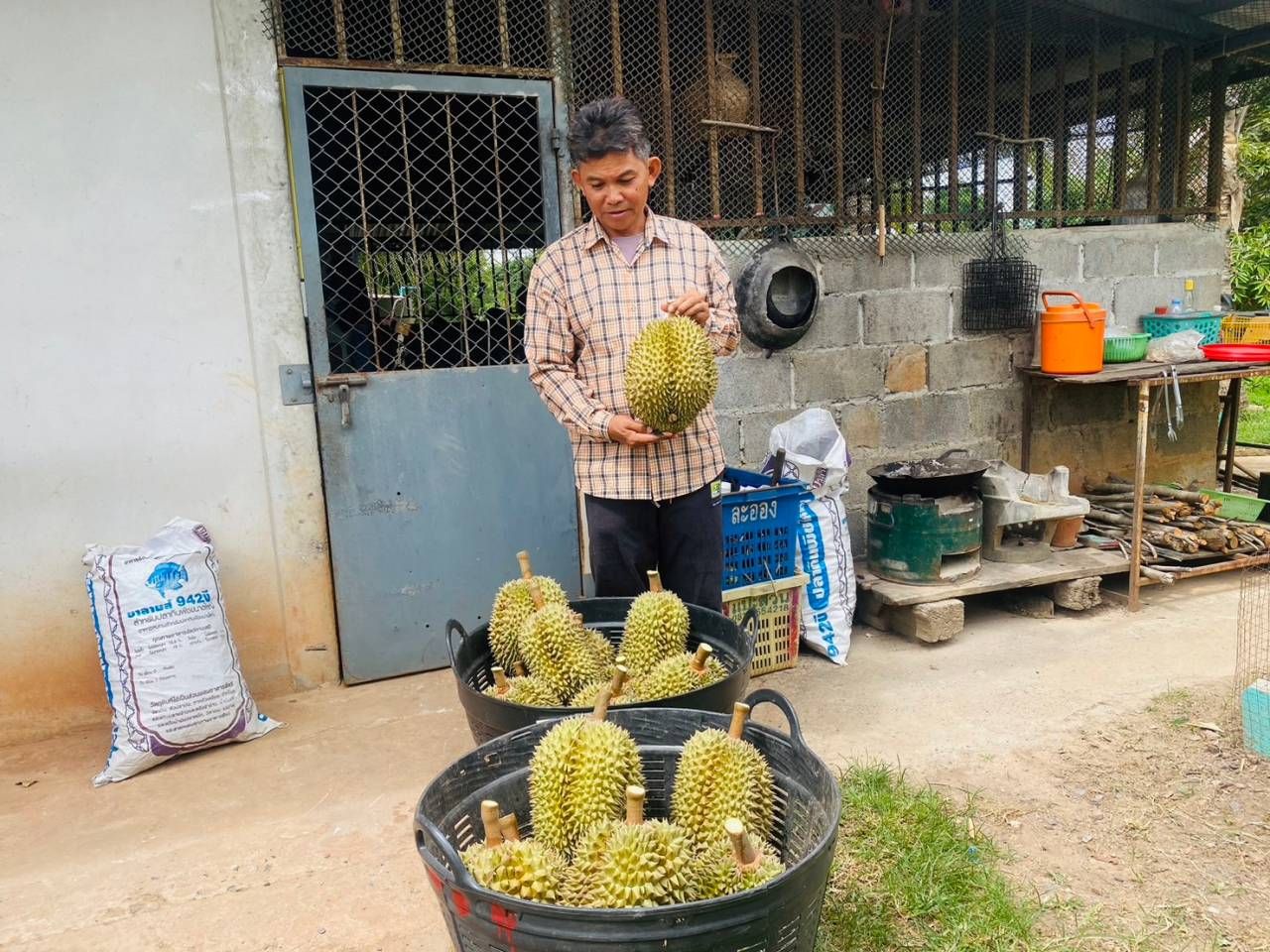 นายอุทัย สุระรัมย์ อายุ 53 ปี เจ้าของสวนทุเรียนบ้านห้วยหมากแดง กล่าวว่า ปีนี้ในพื้นที่ฝนตกน้อย ได้มีการต่อท่อส่งน้ำให้กับต้นทุเรียนทุกต้น แต่ปีนี้ด้วยภาวะแล้งจัดกว่าทุกปีที่ผ่านมา น้ำบาดาลไม่พอใช้รดต้นทุเรียนกว่า 100 ต้น ที่ปลูกมาแล้ว 10 ปี ในช่วงทุเรียนติดผลช่วงเดือนเมษายนที่ผ่านมา ผลทุเรียนได้ขาดน้ำร่วงหล่นเสียหายไปมากกว่า 65% ของผลทุเรียนติดลูก เหลือทุเรียนที่ลูกโตพอตัดขายได้ในช่วงนี้เพียง 35% ของทุเรียนติดผล จากที่ทุกปีมีลูกทุเรียนตัดขายได้มากกว่า 7-8 ตัน มีรายได้ขายทุเรียนได้มากกว่า 8 แสนบาท หรือเหลือทุเรียนตัดขายได้ประมาณ 2 ตันกว่า ขายทุเรียนได้ไม่เกิน 3 แสนบาทเท่านั้น