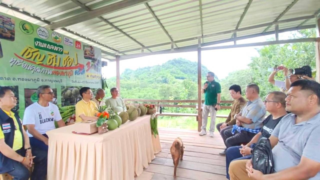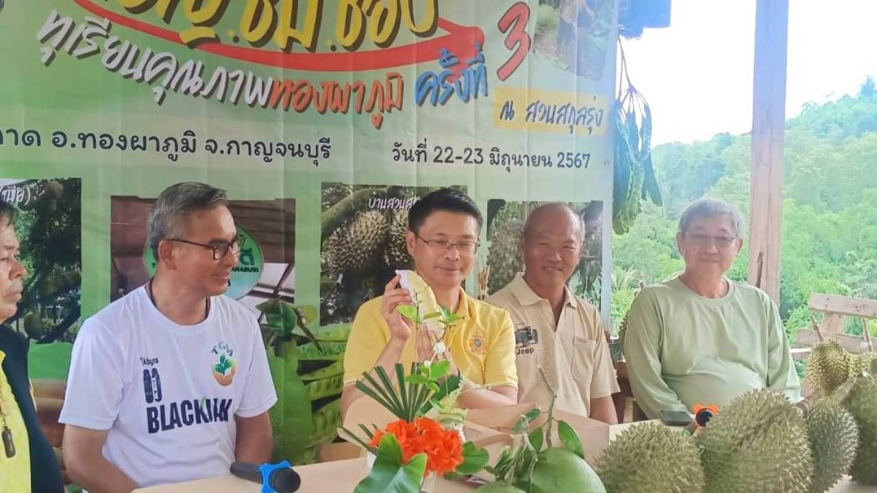 นายอำเภอทองผาภูมิ เป็นประธานแถลงการจัดงาน เชิญ ชิม ช็อป ทุเรียนคุณภาพทองผาภูมิ ครั้งที่ 3 ในวันที่ 22-23 มิถุนายน 2567 นี้ ที่สวนสกุลรุ่ง ต.หินดาด เปิดให้ชิมและเลือกซื้อทุเรียน GI แท้ๆ จากสวน มีการประมูลทุเรียน และเสวนาการผลิตทุเรียนคุณภาพ และความบันเทิง