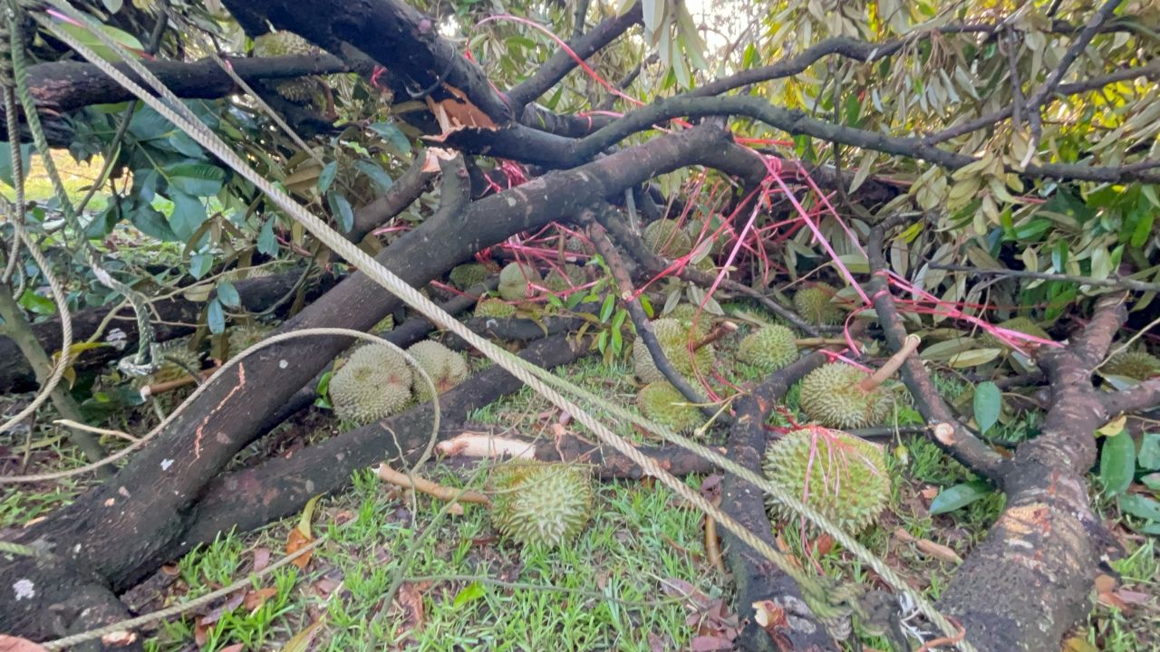 เกษตรกรสวนทุเรียน จ.ตราด น้ำตาตก พายุฤดูร้อนพัดถล่ม ทำต้นทุเรียนหักโค่น ทุเรียนใกล้เก็บเกี่ยว ร่วงนับหมื่นลูก ความเสียหายกว่าล้านบาท ผู้ใหญ่บ้านเร่งสำรวจให้ความช่วยเหลือ
