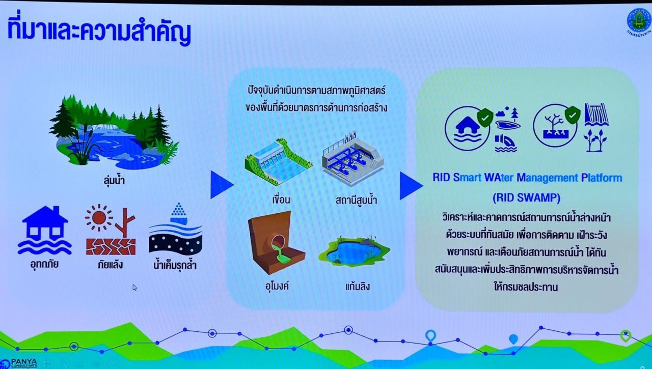 สำหรับแพลตฟอร์มการบริหารจัดการน้ำอัจฉริยะ (RID SWAMP) เป็นการปรับปรุง และจัดทำระบบฐานข้อมูลกลาง GIS ด้านการบริหารจัดการน้ำ โดยรวบรวมข้อมูลให้อยู่ในระบบเดียวกัน สะดวกในการสืบค้น สามารถสั่งการวิเคราะห์ และประมวลผลได้จากส่วนกลาง เพื่อให้ได้ผลการคาดการณ์สถานการณ์น้ำล่วงหน้า พร้อมจัดทำแบบจำลองคณิตศาสตร์ในพื้นที่ สำหรับวิเคราะห์ และคาดการณ์สถานการณ์น้ำท่วม การจัดสรรน้ำ และค่าความเค็ม ด้วยระบบที่ทันสมัย พร้อมระบบการติดตาม เฝ้าระวัง พยากรณ์ และเตือนภัยสถานการณ์น้ำได้ทันท่วงที