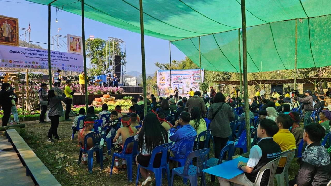 ผู้อำนวยการ สวพส. กล่าวอีกว่า ดังนั้นเพื่อเป็นการถ่ายทอดองค์ความรู้ ลดหรือแก้ไขปัญหาการเผาและฝุ่นควันในภาคเกษตรบนพื้นที่สูงอย่างยั่งยืน ด้วยการปรับระบบเกษตรที่เป็นมิตรต่อสิ่งแวดล้อม อย่างเป็นระบบครบวงจร ภายใต้กระบวนการมีส่วนร่วมของเกษตรกร สวพส. จึงได้จัดงาน “วันถ่ายทอดและแลกเปลี่ยนเรียนรู้ เพื่อแก้ไขปัญหาความยากจน ลดการเผา และฝุ่นละออง PM 2.5 แบบบูรณาการและมุ่งเป้า” ณ บ้านแม่วาก ตำบลแม่นาจร อำเภอแม่แจ่ม จังหวัดเชียงใหม่ โดยกลุ่มเป้าหมายรวมทั้งสิ้น 500 คน ประกอบด้วย ผู้แทนกระทรวงเกษตรและสหกรณ์, คณะผู้ทรงคุณวุฒิจากสำนักงานพัฒนาการวิจัยการเกษตร, เจ้าหน้าที่สถาบันวิจัยและพัฒนาพื้นที่สูง, คณะทำงานบริหารจัดการดิน น้ำ ป่า เพื่อแก้ปัญหาและพัฒนาพื้นที่อำเภอแม่แจ่ม, ผู้แทนหน่วยงานที่เกี่ยวข้อง, เกษตรกรในพื้นที่อำเภอแม่แจ่ม, กลุ่มเกษตรกรเครือข่าย และประชาชนทั่วไป