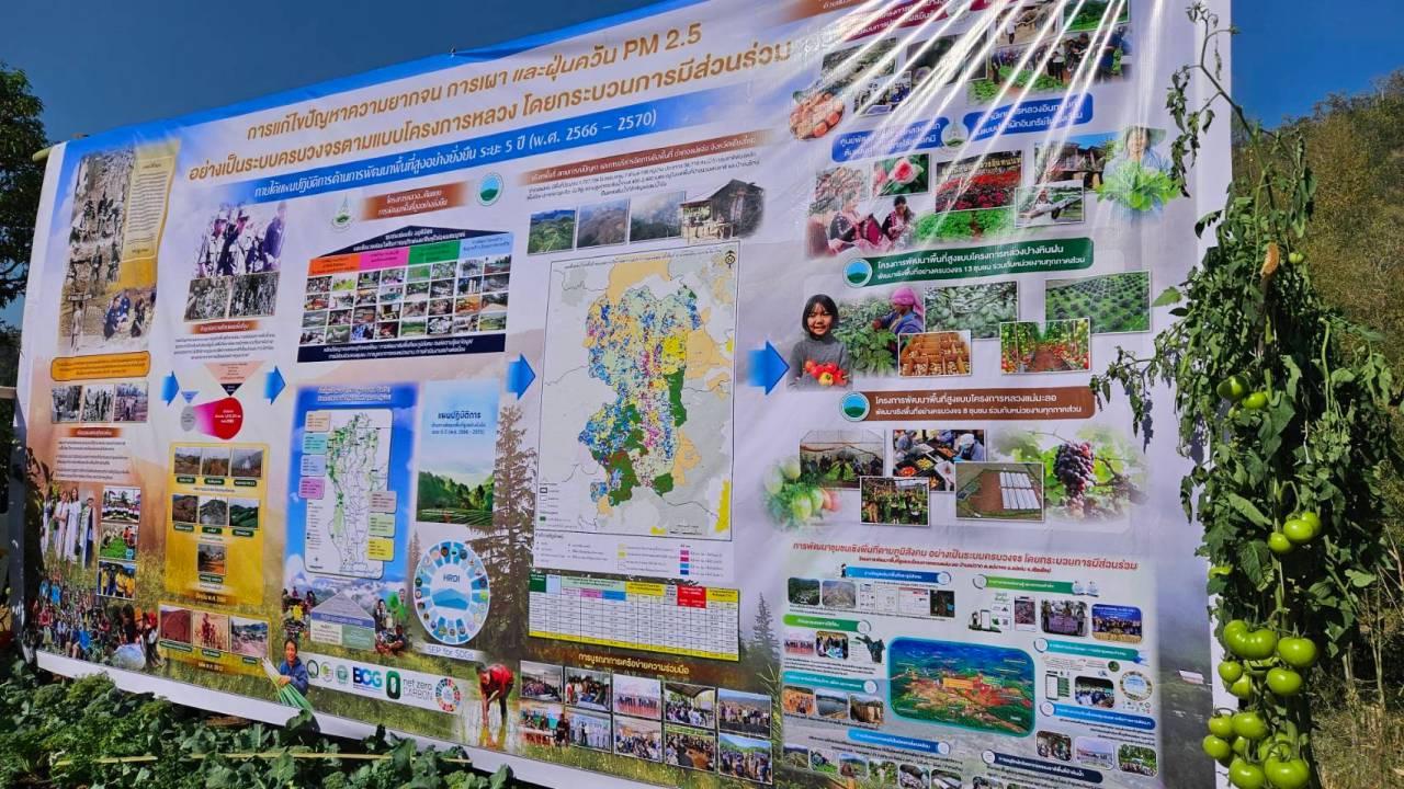 นางสาวเพชรดา อยู่สุข รองผู้อำนวยการสถาบันวิจัยและพัฒนาพื้นที่สูง (สวพส.) กล่าวว่า สวพส. และกระทรวงเกษตรและสหกรณ์ ได้ดำเนินงาน “โครงการพัฒนาพื้นที่สูงแบบโครงการหลวง” มุ่งเน้นดำเนินการเชิงพื้นที่อย่างเป็นระบบครบวงจร โดยกระบวนการมีส่วนร่วมกับชุมชน และหน่วยงานต่างๆ แก้ไขปัญหาให้กับชุมชนตามบริบทพื้นที่อย่างยั่งยืน ทั้งด้านเศรษฐกิจ สังคม สิ่งแวดล้อม ตลอดจนการสนับสนุนโครงสร้างพื้นฐานที่จำเป็น รวมทั้งมีการประยุกต์ใช้องค์ความรู้จากผลงานวิจัยเพื่อสนับสนุนการพัฒนา โดยเฉพาะ “การปรับระบบเกษตรที่เป็นมิตรกับสิ่งแวดล้อม” เพื่อสร้างรายได้เพิ่ม และยังช่วยลดการเผาในพื้นที่เกษตร โดยมีชุมชนหรือพื้นที่ต้นแบบที่ประสบผลสำเร็จ (Good Practice) ซึ่งได้รับการยอมรับทั้งในระดับประเทศและนานาชาติ