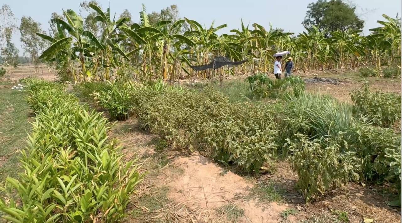 เกษตรกรชาวบ้านทัน กล่าวต่อว่า เราก็เก็บข้อมูลการทำเกษตรมาจากเพื่อนชาวต่างชาติ จึงเป็นจุดตั้งต้นการขุดพื้นที่ดินให้เป็นหลุม 2.5 x 2.5 เมตร ลึก 60 ซม. ขุดไปกว่า 40 หลุม และได้นำปุ๋ยขี้วัว เศษใบไม้ ที่สามารถย่อยสลายได้ตามธรรมชาติ เอาไว้ในหลุม นำดินมากลบ ราดด้วยน้ำหมัก EM ปิดด้วยผ้าใบและฟาง และรดน้ำ ใช้เวลากว่า 1 ปี ก็ได้ขุดสระน้ำไว้ถึง 5 บ่อสูบ และได้เริ่มแบ่งออกมา 7 ไร่ เพื่อมายกร่องขึ้น ปลูกต้นไม้ต่างๆ พืชสมุนไพร ต้นกล้วย หอมทอง กล้วยน้ำว้า และพืชผัก พริกมะเขือ รอบๆ บริเวณที่ปลูกต้นไม้ ได้ขุดทำเป็นร่องน้ำ อาศัยน้ำฝนตามธรรมชาติ ให้มีน้ำหล่อเลี้ยงอยู่ตลอดเวลา ถ้าปริมาณฝนตกมากขึ้น ก็จะระบายน้ำออกหมด ปล่อยน้ำใหม่เข้ามา เพื่อเป็นการลดปริมาณความเค็มของเกลือ