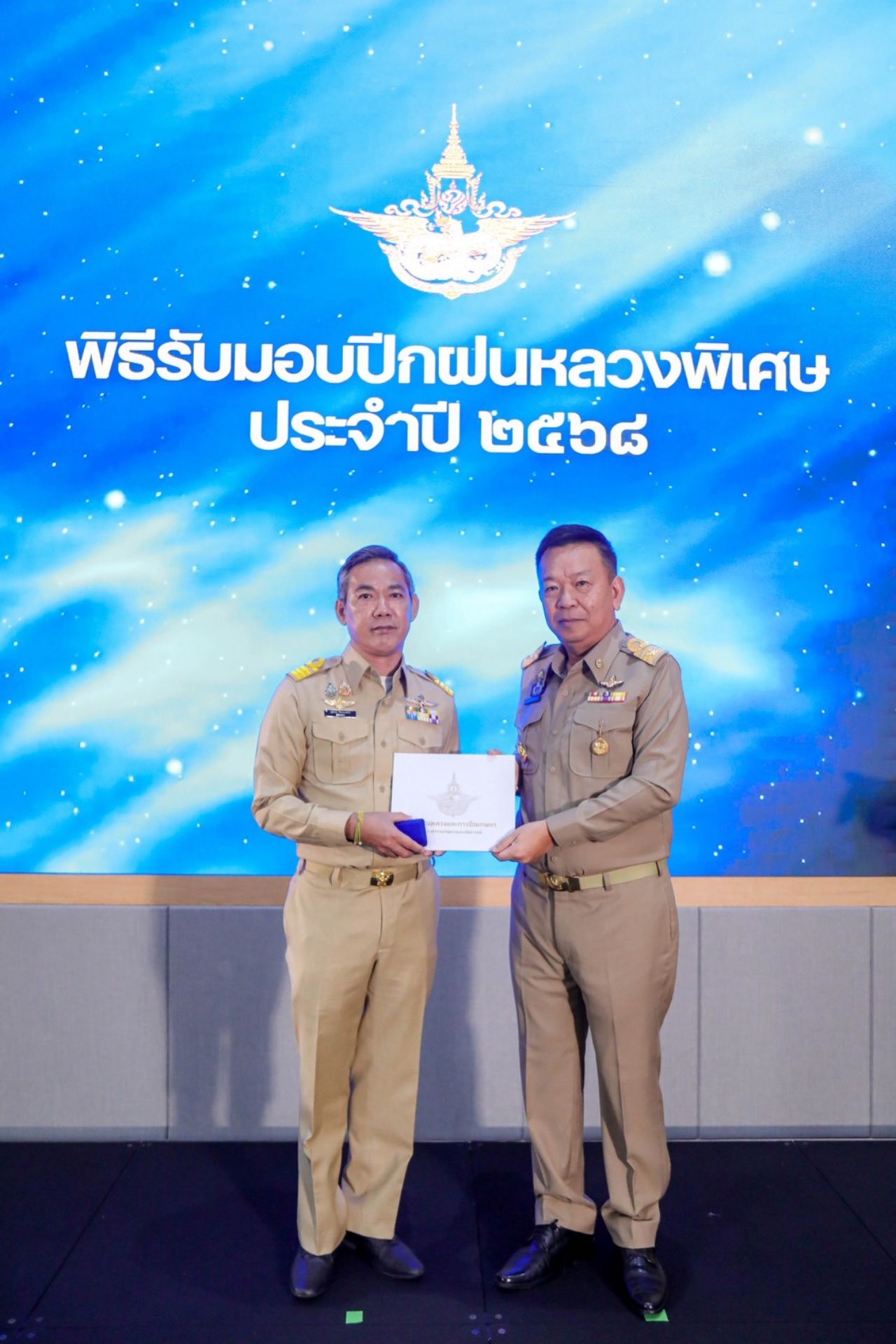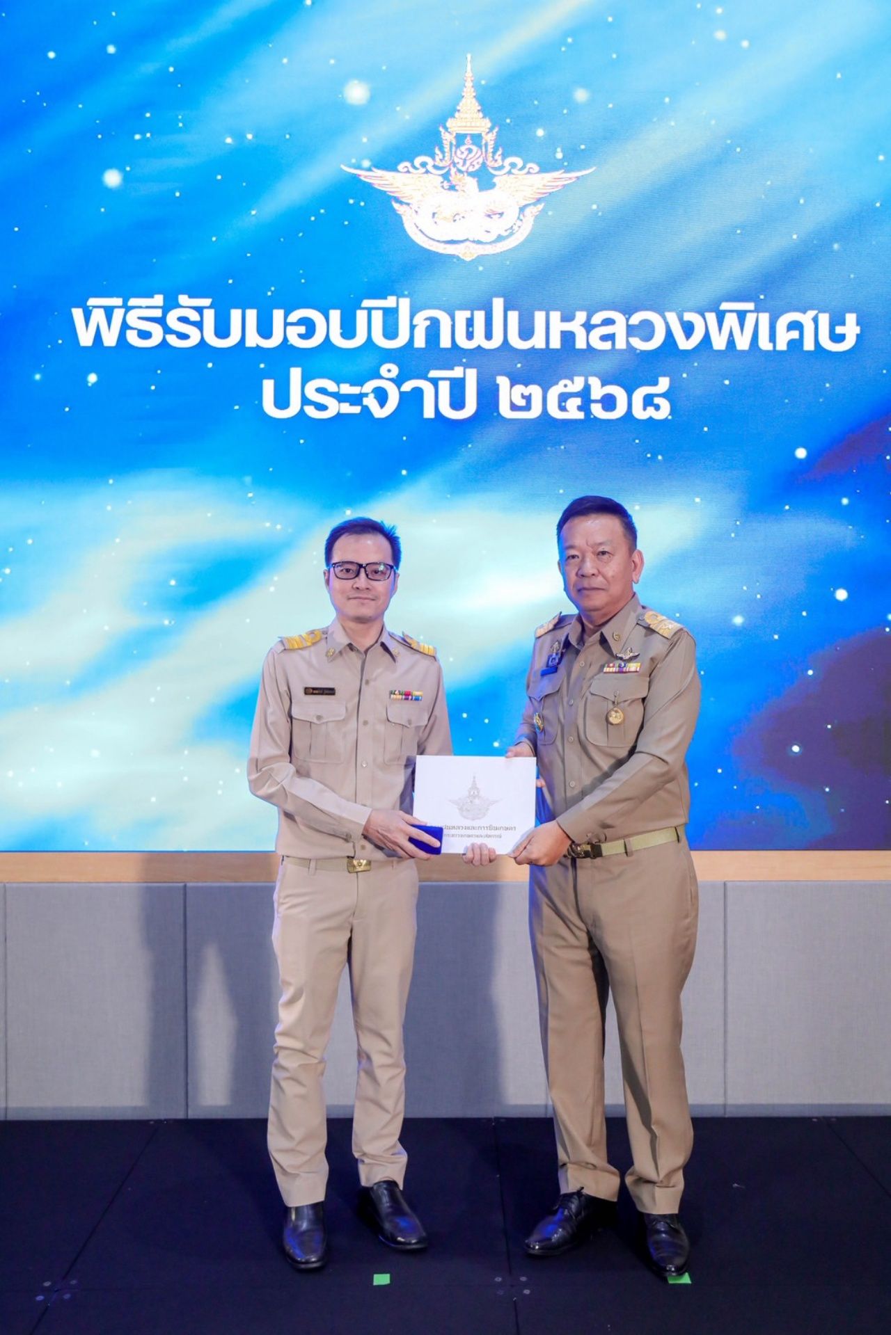 วันที่ 26 พฤษภาคม 2568 เวลา 09.30 น. นายราเชน ศิลปะรายะ อธิบดีกรมฝนหลวงและการบินเกษตร เป็นประธานในพิธีรับมอบปีกฝนหลวงพิเศษ ประจำปี 2568 โดยมีนายไพจิตร เค้ากล้า รองอธิบดีกรมฝนหลวงและการบินเกษตร ด้านวิชาการ ผู้บริหาร และผู้เข้าร่วมพิธีจากหน่วยงานสังกัดต่าง ๆ ได้แก่ ข้าราชการในสังกัดกระทรวงเกษตรและสหกรณ์ กระทรวงทรัพยากรธรรมชาติและสิ่งแวดล้อม กระทรวงศึกษาธิการ กระทรวงกลาโหม กระทรวงการต่างประเทศ และหน่วยงานภาคเอกชน เข้าร่วมในพิธีดังกล่าว ณ ห้องประชุมหยาดพิรุณ ชั้น 3 กรมฝนหลวงและการบินเกษตร ซึ่งในพิธีการประกอบด้วยการถวายราชสักการะพระบรมฉายาลักษณ์พระบาทสมเด็จพระเจ้าอยู่หัว การรับปีกฝนหลวงพิเศษพระราชทานเบื้องหน้าพระบรมฉายาลักษณ์พระบาทสมเด็จพระบรมชนกาธิเบศร มหาภูมิพลอดุลยเดชมหาราช บรมนาถบพิตร และการมอบเกียรติบัตร