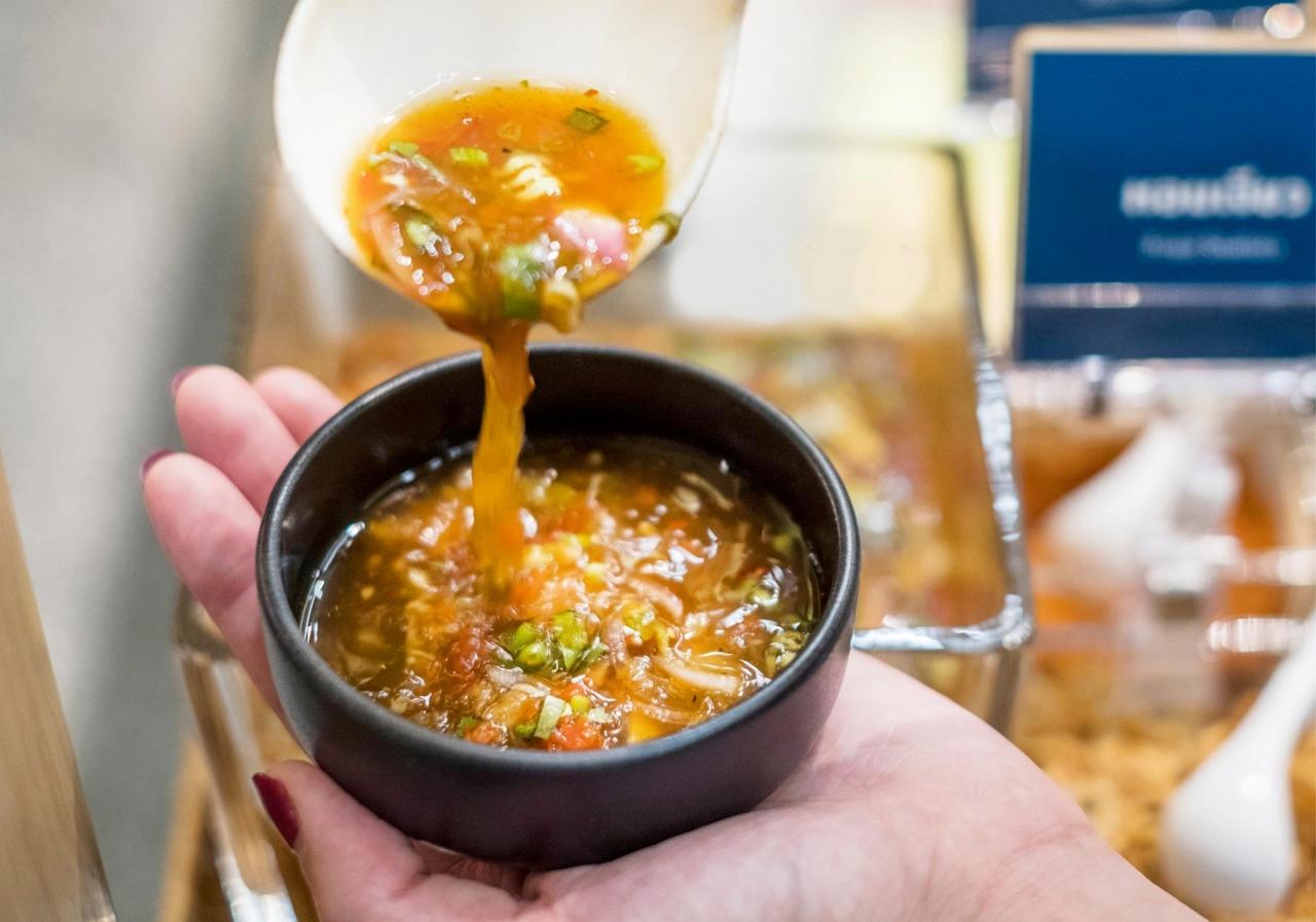 เสิร์ฟมาพร้อมน้ำจิ้มหลากหลาย เช่น น้ำจิ้มงา น้ำจิ้มเต้าเจี้ยว น้ำจิ้มซีฟู้ด ความสนุกมันอยู่ตรงที่ ใครชอบน้ำจิ้มแบบไหนก็ผสมน้ำจิ้มเองได้ตามใจปาก ทางร้านมีเคาน์เตอร์ผสมน้ำจิ้มให้โดยเฉพาะ