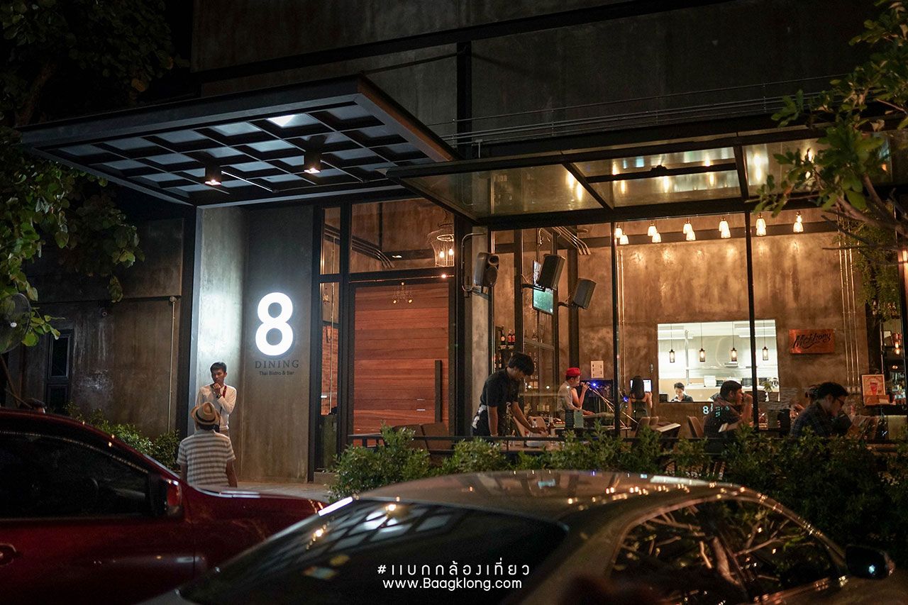 ตบท้ายด้วยมื้อเย็นเรามาทานข้าวกันที่ 8 DINING ความโดดเด่นของร้านเน้นอาหารไทยแท้ ยกเมนูพิเศษอาหารท้องถิ่นขึ้นชื่อในแต่ละภาคมาไว้ที่นี่โดยเชฟอายุน้อยแต่ฝีมือไม่ธรรมดา เช่น แกงคั่วเนื้อ ห่อหมกใบยอ ปลากะพงย่างใบมะรุม แกงส้มกุ้งลายเสื้อ ผัดหมี่โคราช คั่วกลิ้งเนื้อแกะ ยำส้มโอปลาดุกฟู ผัดหมี่โคราช ยำปลาหมึกย่างพริกย่าง เป็นต้น ร้านนี้มีดนตรีสด นักร้องเสียงดี มาขับกล่อมเราให้เพลิดเพลินกับการทานอาหารค่ำอีกด้วย