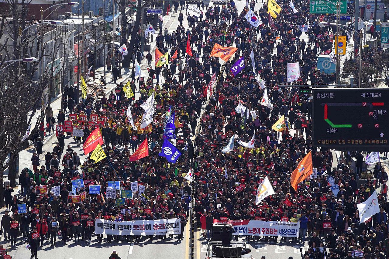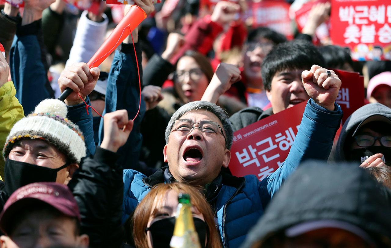 ข่าวแจ้งว่า ทางการเกาหลีใต้ได้ระดมกำลังตำรวจมารักษาความปลอดภัยที่ด้านนอกศาลรัฐธรรมนูญ ระหว่างมีการอ่านคำวินิจฉัยเมื่อ 10 มี.ค. ขณะที่มีประชาชนจำนวนมากมารอฟังคำตัดสิน และชุมนุมประท้วงต่อต้านปาร์ก กึน เฮและรัฐบาล ขณะเดียวกันก็มีฝูงชนที่มาชุนนุมสนับสนุนนางสาวปาร์กเช่นกัน