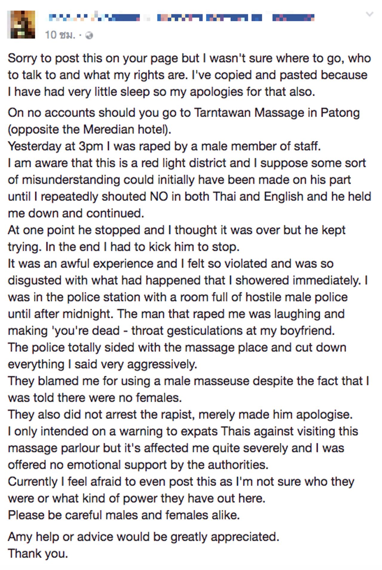 ข้อความในโพสต์อ้างว่า “เตือนทุกคนไม่ควรไปนวด ถนนพัฒน์พงศ์ (ตรงข้ามโรงแรม เลอ เมอริเดียน) เมื่อวานเวลาบ่าย 3 โมง ฉันถูกข่มขืนโดยพนักงานชายคนหนึ่ง ฉันรู้ดีว่าแถวนี้เป็นย่านเที่ยวกลางคืน และมันอาจเริ่มจากความเข้าใจผิด จนกระทั่งฉันร้องตะโกนออกไปว่า "ไม่" เป็นภาษาไทยและภาษาอังกฤษ เขาก็ยังจับฉันนอนลง แล้วทำต่อ พอถึงจุดหนึ่ง เขาถึงหยุด ทีแรกฉันคิดว่ามันจบแล้ว แต่เขาก็ยังพยายามอีก สุดท้ายฉันถีบเขา เขาถึงได้หยุด