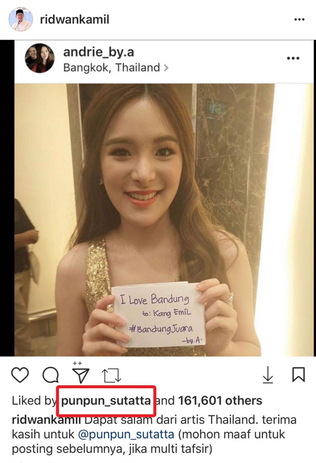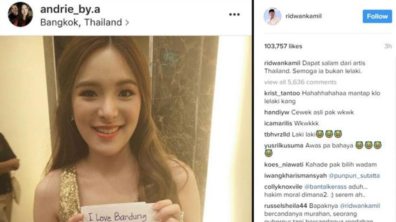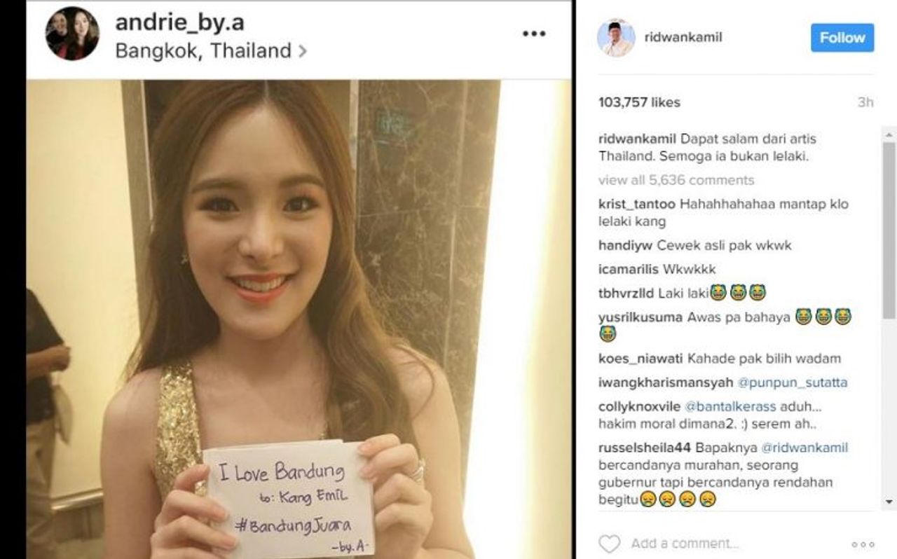 เมื่อวานนี้ นาย Ridwan Kamil นายกเทศมนตรีของเมืองบันดุง หนึ่งในเมืองที่ได้รับความนิยมจากนักท่องเที่ยวมากที่สุดของประเทศอินโดนีเซีย เกิดอาการพลาดอย่างแรง เมื่อนักท่องเที่ยวชาวอินโดนีเซียรายหนึ่ง ได้ถ่ายรูป 'ปันปัน สุทัตตา' ดาราวัยรุ่นสาวสวยจากประเทศไทย ขณะถือกระดาษที่ระบุข้อความว่า “I love Bandung to: Kang Emil #BandungJuara -by.A-“ และโพสต์ลงอินสตราแกรม @andrie_by.a ซึ่งนาย Kamil ได้แคปภาพดังกล่าวไปแชร์ต่อไปอินสตราแกรมส่วนตัว พร้อมเขียนแคปชั่นว่า “ผมหวังว่าเธอจะไม่ใช่ผู้ชาย” ในภาษาอินโดนีเซีย