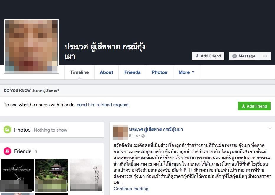ล่าสุดพบว่ามีการเปิดเฟซบุ๊กชื่อ "ประเวศ ผู้เสียหาย กรณีกุ้งเผา" และโพสต์ข้อความชี้แจงในนามของลูกค้า โดยเขียนเล่าถึงเหตุการณ์ว่าตัวเองถูกทำร้ายจากเจ้าของร้านและพนักงานที่รุมชกถึง 3 รอบ ส่งผลให้ตอนนี้ยังพักรักษาตัวอยู่ ซึ่งบาดแผลยังระบมและความดันขึ้นสูงผิดปกติ จึงอยากวอนขอสังคมช่วยให้ความเป็นธรรมด้วย เพราะสิ่งที่ได้รับนั้นเกินกว่าเหตุ เรื่องแค่นี้ไม่คิดว่าจะถูกทำร้าย โดยนายประเวศได้เขียนทิ้งท้ายไว้ว่า ขอให้สังคมรอชมหลักฐานฉบับเต็ม เพราะคลิปต่างๆ ที่คู่กรณีนำเสนอนั้นเป็นเพียงส่วนหนึ่งเท่านั้น (คลิกที่นี่เพื่ออ่านข้อความทั้งหมด)