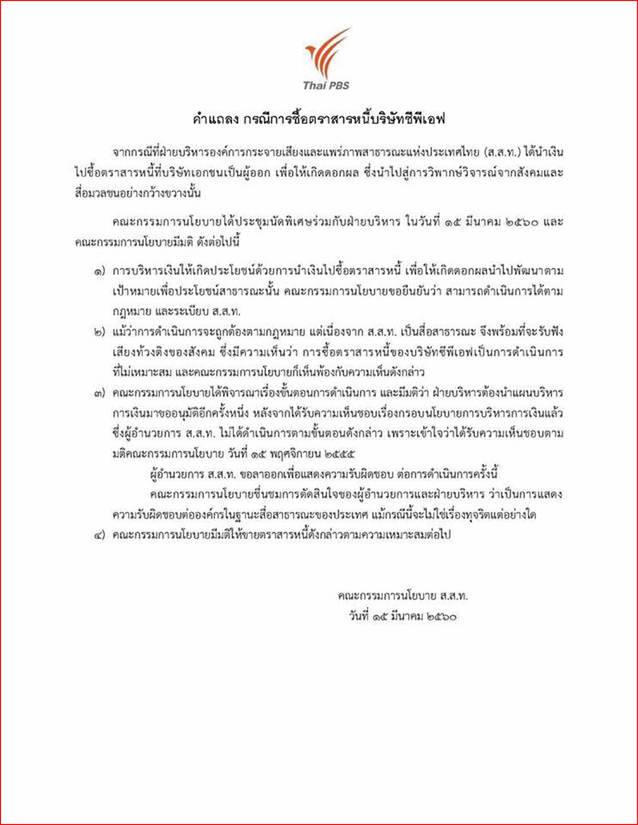 - ไทยพีบีเอส ประกาศยุติการลงทุนตราสารหนี้บางบริษัท หลังทำสังคมข้องใจ