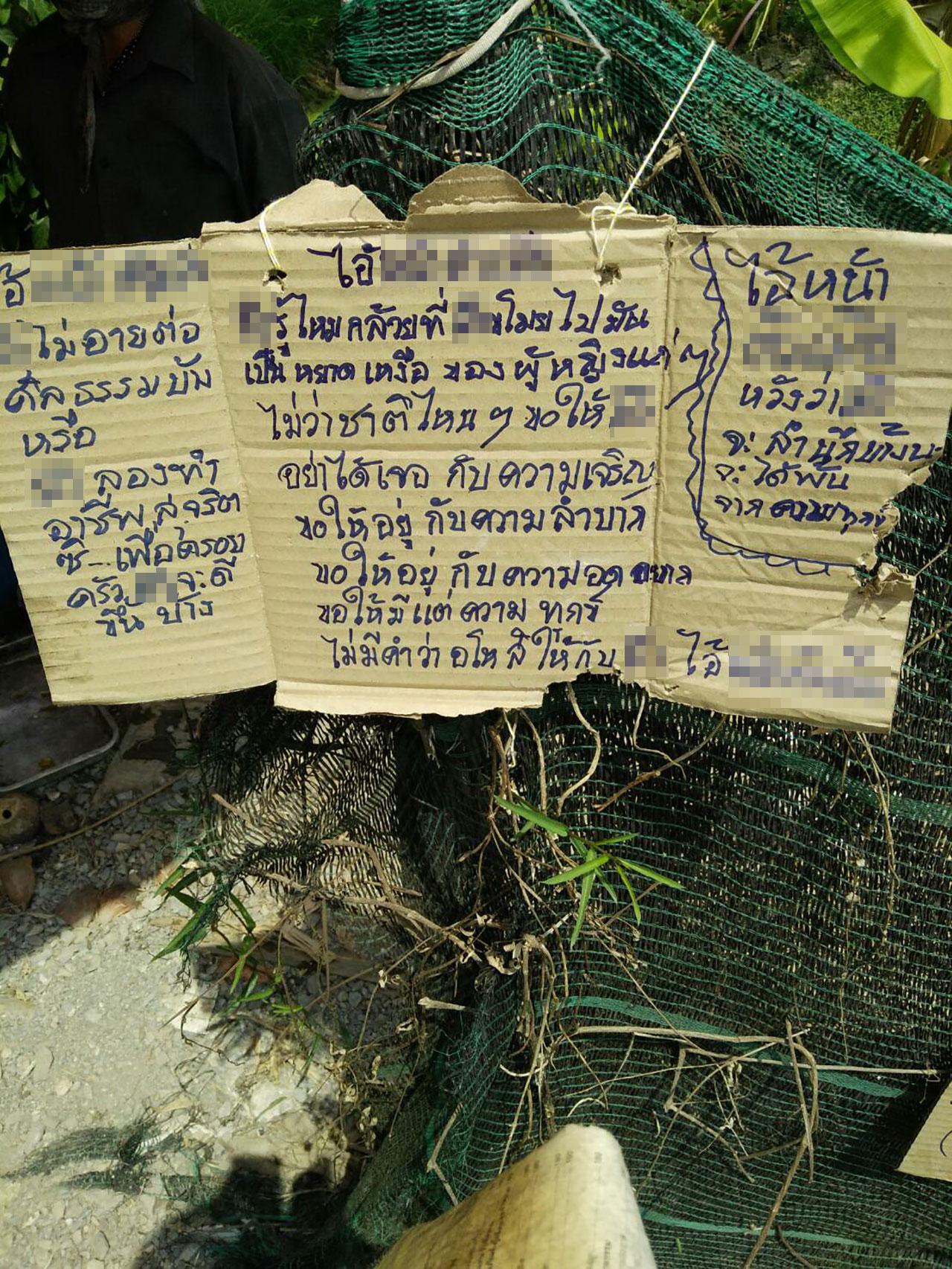 เมื่อเวลา 09.30 น.วันที่ 16 มี.ค.60 ผู้สื่อข่าวได้รับแจ้งจากชาวบ้านว่า มีเจ้าของสวนกล้วยสุดทน เขียนป้ายด่าโจรขโมยกล้วยในสวนแขวนติดไว้กับผ้าถุงไว้ริมถนนซอยวัดดงเกตุ ต.สามพราน อ.สามพราน จ.นครปฐม จึงเดินทางไปตรวจสอบพบที่รั้วสวนฝรั่งและสวนกล้วย มีป้ายกระดาษเขียนด้วยปากกาเมจิก 4 ป้าย และผ้าถุงแขวนติดกับป้าย 1 ตัว โดยในข้อความทั้ง 4 ป้าย บรรยายถึงโจรที่มาขโมยตัดกล้วยในสวนไปตลอดเวลา 3 ปี ไม่คิดทำมาหากิน ขโมยของคนอื่น เจ้าของเขาเดือดร้อน ผู้หญิงแก่ๆ เขาทำมาหากินตากแดด ตากร้อน และมีการสาปแช่งรวมถึงนำผ้าถุงมาแขวนไว้ให้โจรที่มาขโมยตัดกล้วยเอาไปนุ่ง ให้อายมาขโมยกล้วยของเจ้าของสวนที่เป็นผู้หญิงแก่ๆ