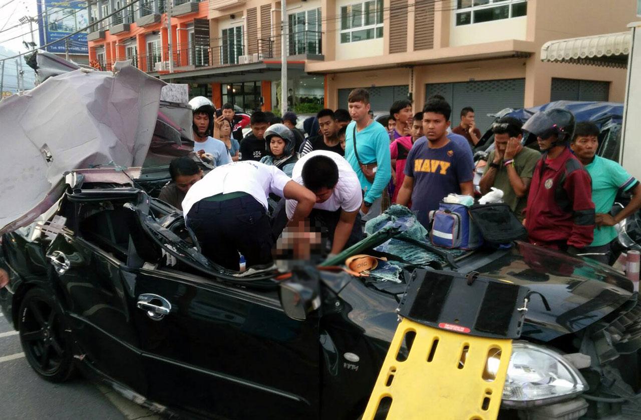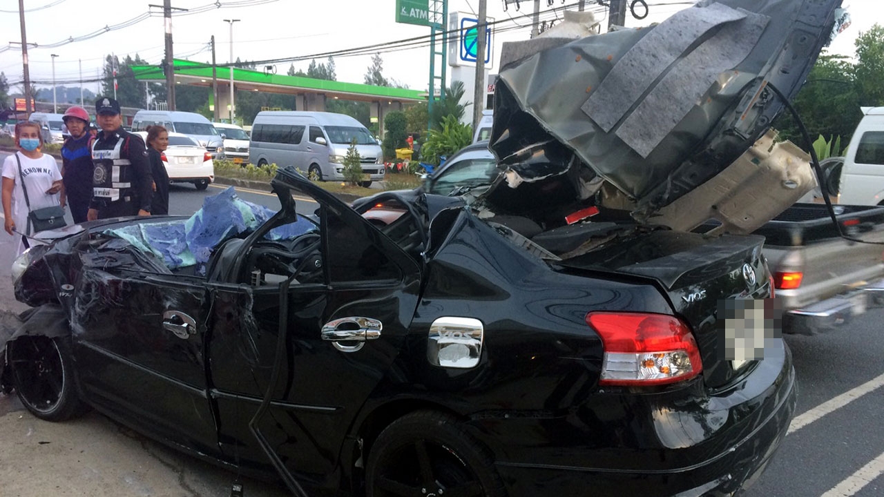พบรถเก๋งยี่ห้อโตโยต้าวีออส สีดำ ทะเบียน กม 4601 สงขลา ตะแคงข้าง สภาพหลังคาเปิดพังเสียหาย จากนั้นชาวบ้านที่อยู่ใกล้เคียงได้ช่วยกันดันตัวรถให้กลับลงพื้นตามปกติ ภายในรถพบร่างหญิงสาวชาวต่างชาตินอนจมกองเลือดอยู่ที่บริเวณเบาะคนขับ หน่วยกู้ชีพจึงนำผู้บาดเจ็บออกจากตัวรถพร้อมกับนำส่ง รพ.วชิระภูเก็ตเป็นการด่วน เนื่องจากไม่ได้สติและมีเลือดไหลหลายแห่งในร่างกาย ทราบชื่อในเวลาต่อมาคือ Miss Kateryna Mizerniuk อายุ 26 ปี สัญชาติยูเครน ใกล้ๆ กันยังพบรถยนต์จำนวน 2 คัน และรถ จยย.อีก 2 คัน ถูกชนพังเสียหาย แต่ไม่มีผู้บาดเจ็บ