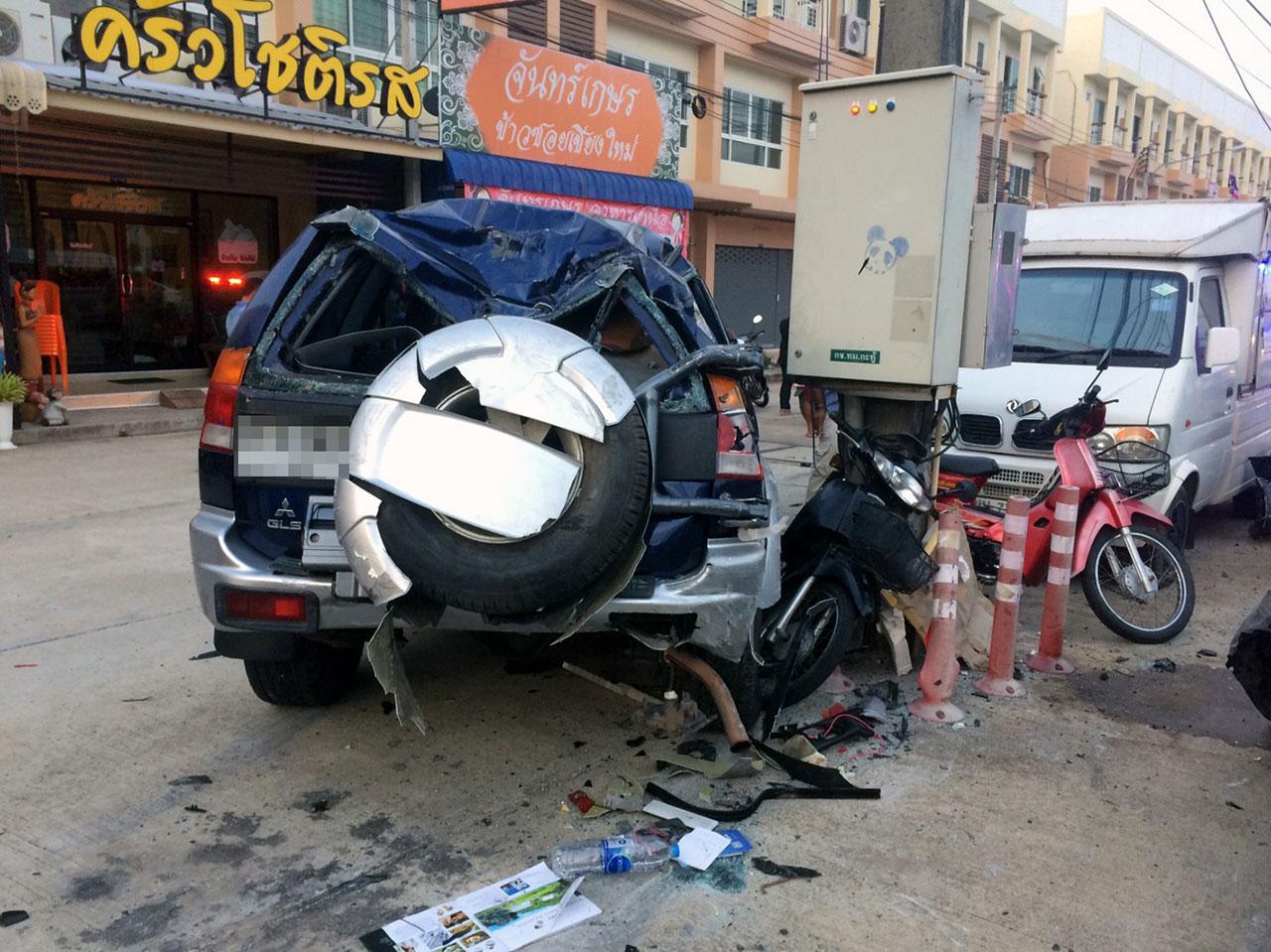 สาวยูเครนซิ่งเก๋งวีออสหลุดโค้ง พุ่งชนรถยนต์ 2 คัน-จยย.2 คัน เสียหาย ก่อนชนเสาไฟฟ้าข้างทาง ตะแคงข้าง บาดเจ็บสาหัสติดคาซากรถริมถนนพระภูเก็ตแก้ว ต.กะทู้ อ.กะทู้...