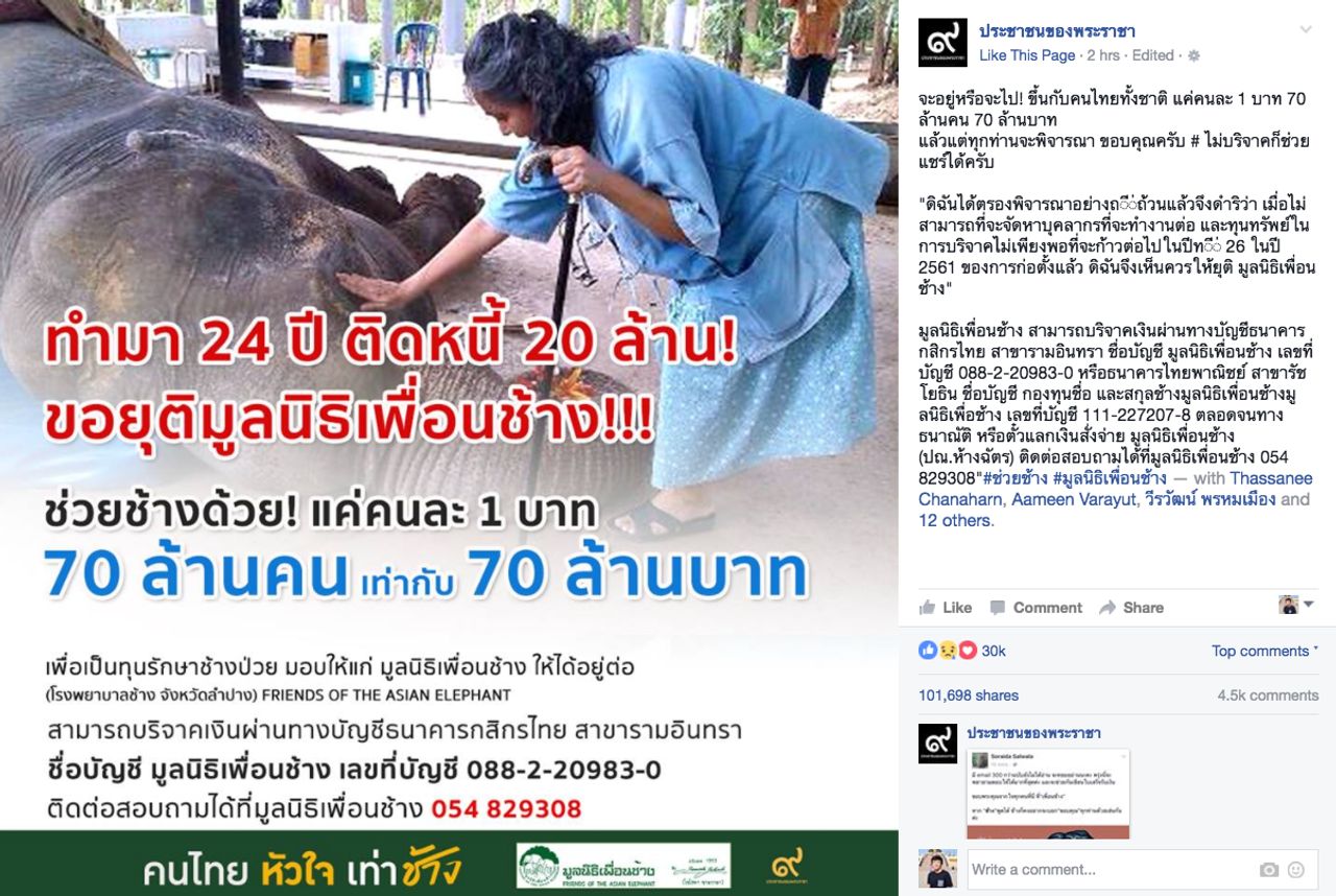 ล่าสุดมีรายงานว่า โลกออนไลน์ได้แห่แชร์ภาพจากเฟซบุ๊กแฟนเพจ 'ประชาชนของพระราชา' ที่มีภาพข้อความเชิญชวนบริจาคให้ ‘มูลนิธิเพื่อนช้าง’ โดยระบุข้อความว่า “จะอยู่หรือจะไป! ขึ้นกับคนไทยทั้งชาติ แค่คนละ 1 บาท 70 ล้านคน 70 ล้านบาท แล้วแต่ทุกท่านจะพิจารณา ขอบคุณครับ #ไม่บริจาคก็ช่วยแชร์ได้ครับ” ซึ่งล่าสุดมียอดแชร์เกือบ 1 แสนครั้งภายในเวลาเพียง 2 ชั่วโมง