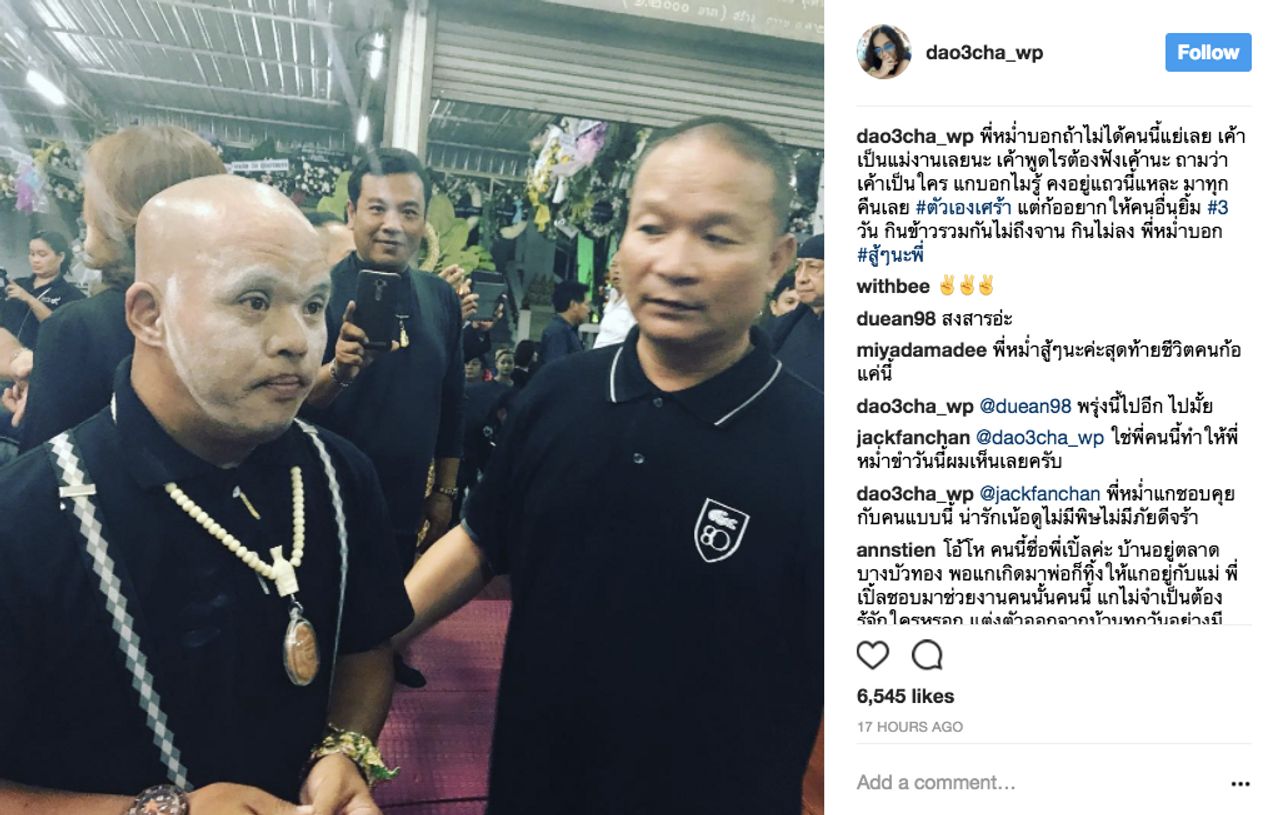 โดยข้อความทั้งหมดคือ "พี่หม่ำบอกถ้าไม่ได้คนนี้แย่เลย เค้าเป็นแม่งานเลยนะ เค้าพูดไรต้องฟังเค้านะ ถามว่าเค้าเป็นใคร แกบอกไม่รู้ คงอยู่แถวนี้แหละ มาทุกคืนเลย #ตัวเองเศร้า แต่ก้ออยากให้คนอื่นยิ้ม #3 วัน กินข้าวรวมกันไม่ถึงจาน กินไม่ลง พี่หม่ำบอก #สู้ๆนะพี่"