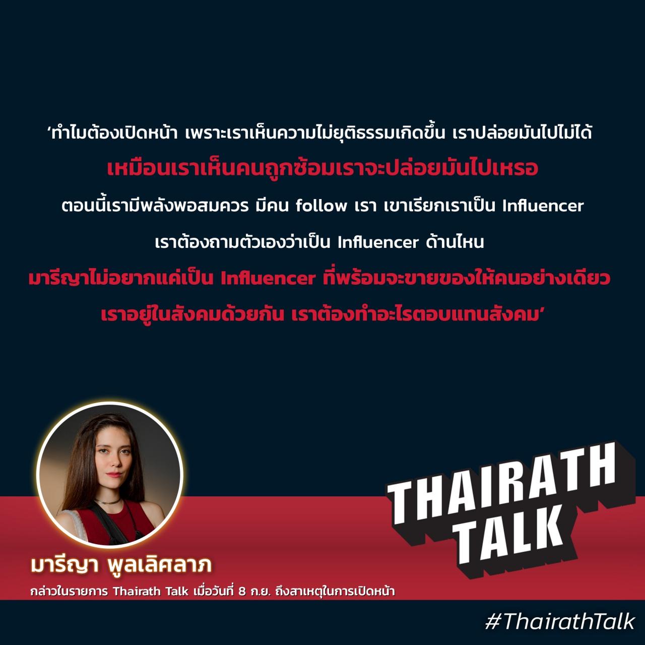 Thairath Talk : สิ่งที่มารีญาทำในวันนี้ อะไรคือเหตุผลที่มารีญาไปร่วมการเรียกร้องของคนรุ่นใหม่ในครั้งนี้ครับ