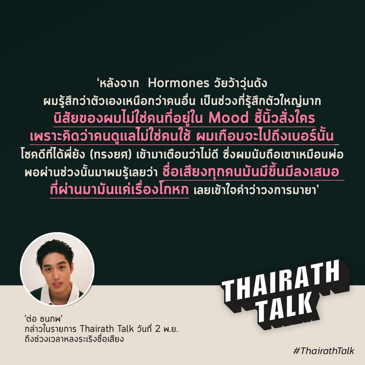 ต่อ ธนภพ กรอกตานึกคำตอบสักพัก ก่อนเล่าให้เราฟังว่า สมัยหลัง Hormones ช่วงแรกๆ ตอนนั้นเรารู้สึกเหนือคนอื่น เป็นช่วงที่ตัวเองตัวใหญ่มาก เริ่มเปลี่ยนไปไม่เท่าไหร่ แต่เริ่มเปลี่ยนไปกับคนที่เลี้ยงเรามา กับที่ค่าย ซึ่งเป็นแค่ครั้งเดียวแล้วเลิกเลย หยุดเลย มีคนเตือนแค่ครั้งเดียว เพราะสุดท้ายแล้วผมมาจากเด็กที่ไม่มีอะไรมาก่อน แล้ววันนี้ที่ผมรู้สึกว่าผมไม่ได้เจ๋ง ผมไม่ได้อะไรเลย เพราะผมไม่ได้ลืมว่าผมมาจากไหน ผมก็เป็นผมแบบนี้แหละ