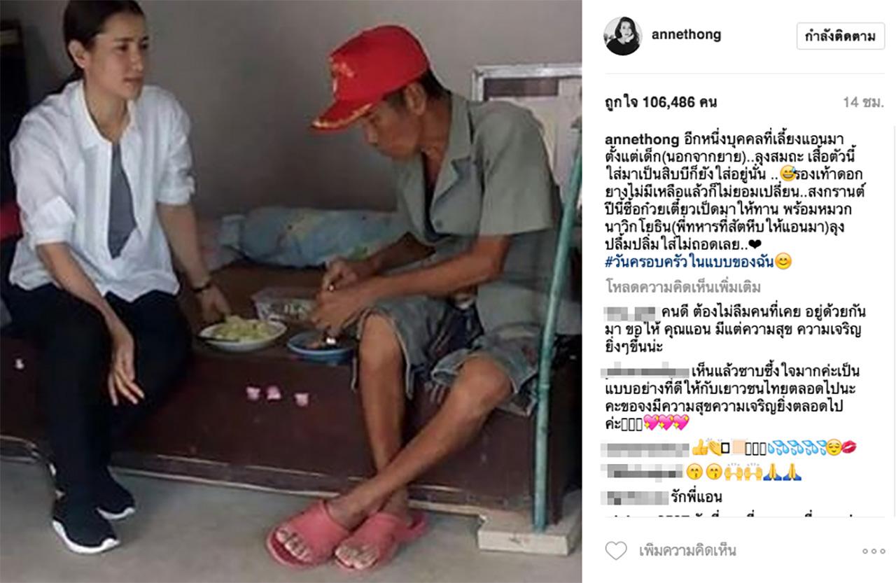 เจ้าหญิงแห่งวงการบันเทิงไทย แอน ทองประสม โพสต์รูปวันครอบครัวในเทศกาลสงกรานต์ในแบบของตัวเอง ด้วยการไปเยี่ยมคุณลุงที่เคยเลี้ยงดูเธอมาตั้งแต่เด็ก ด้วยการซื้อก๋วยเตี๋ยวเป็ดและหมวกไปฝากคุณลุง ชาวเน็ตแห่ชื่นชมเพียบ