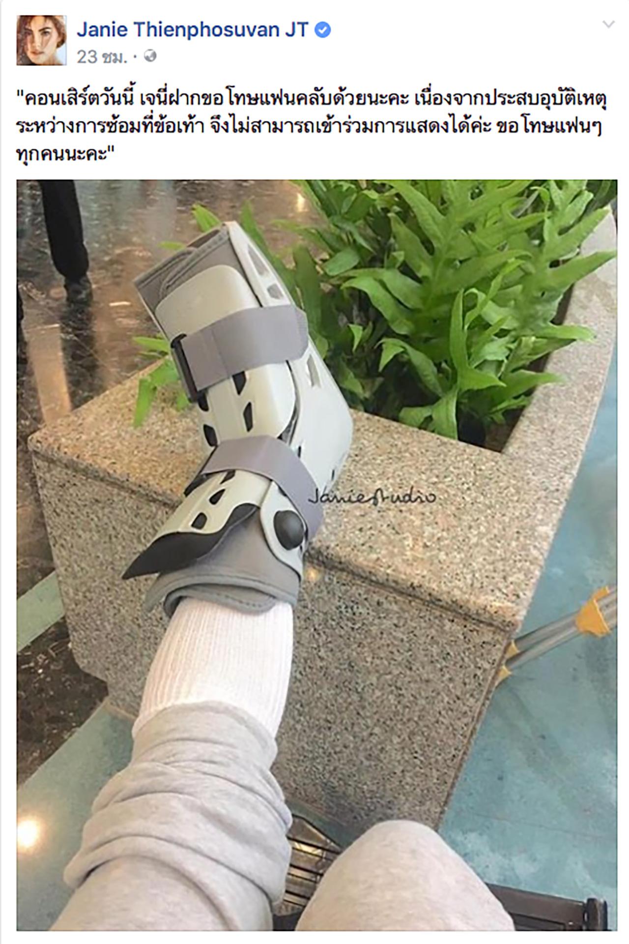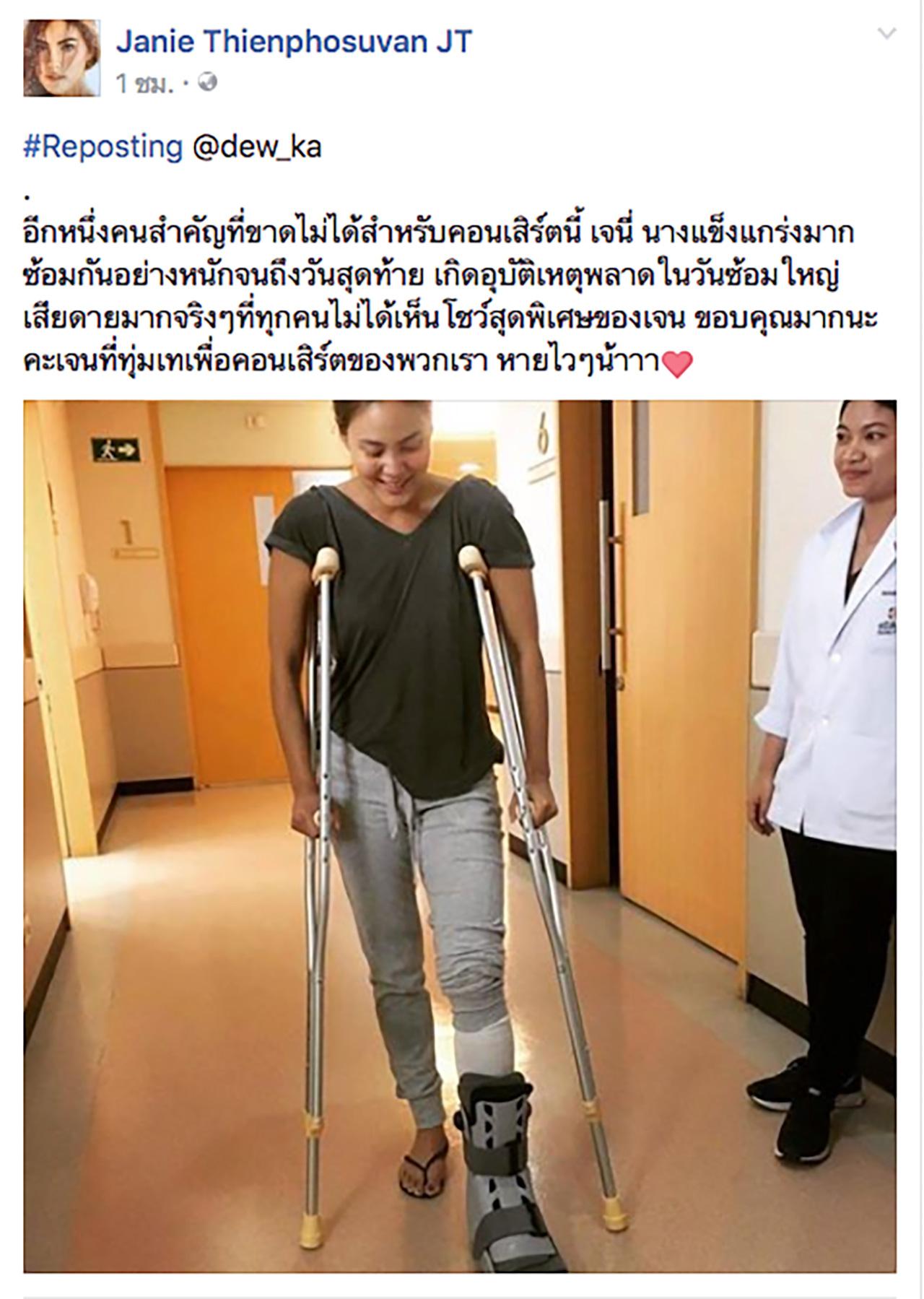 และหลังจากนั้น ดิว ปิ่นกมล มาลีนนท์ ก็ได้โพสต์รูปของนางเอกสาวเจนี่อีกครั้ง ซึ่งเป็นรูปที่สาวเจนี่ใส่เฝือกอ่อนที่ขาซ้ายพร้อมไม้เท้า และมีแค็ปชั่นว่า "อีกหนึ่งคนสำคัญที่ขาดไม่ได้สำหรับคอนเสิร์ตนี้ เจนี่ นางแข็งแกร่งมาก ซ้อมกันอย่างหนักจนถึงวันสุดท้าย เกิดอุบัติเหตุพลาดในวันซ้อมใหญ่ เสียดายมากจริงๆ ที่ทุกคนไม่ได้เห็นโชว์สุดพิเศษของเจน ขอบคุณมากนะคะเจนที่ทุ่มเทเพื่อคอนเสิร์ตของพวกเรา หายไวๆ น้าาา"