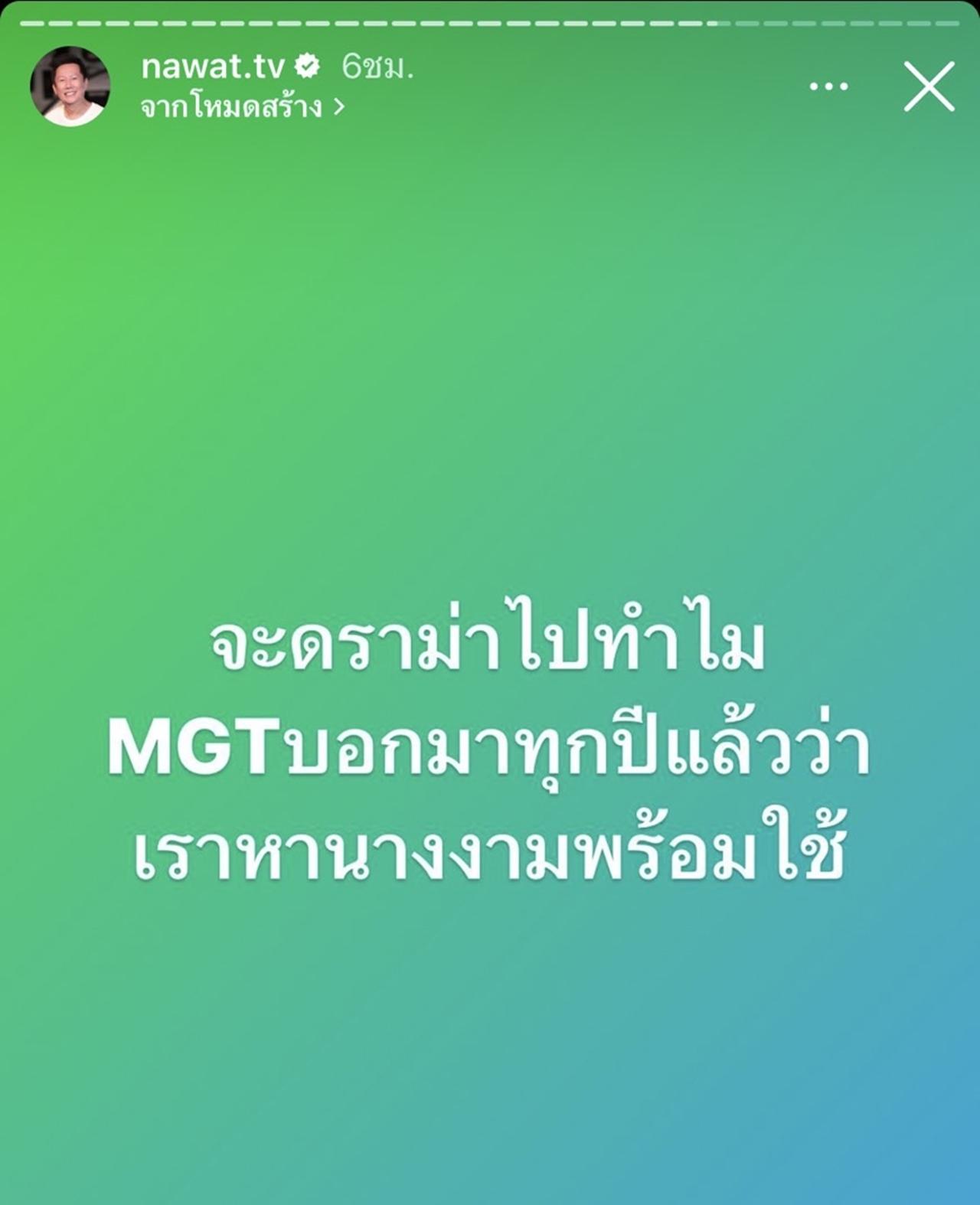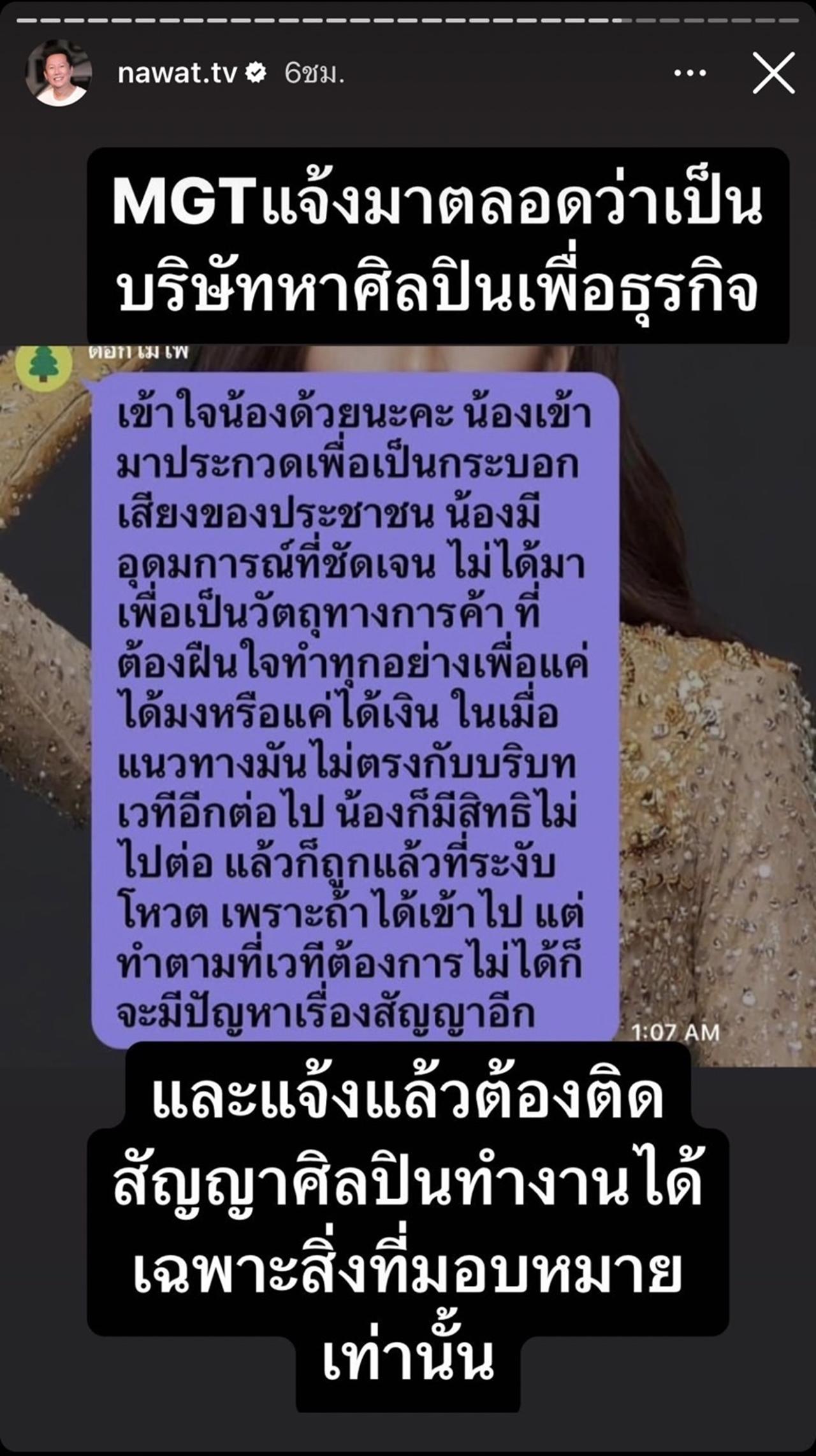 และ ณวัฒน์ ก็ได้เขียนว่า "MGT แจ้งมาตลอดว่าเป็นบริษัทหาศิลปินเพื่อธุรกิจ และแจ้งแล้วต้องติดสัญญาศิลปินทำงานได้เฉพาะสิ่งที่มอบหมายเท่านั้น"