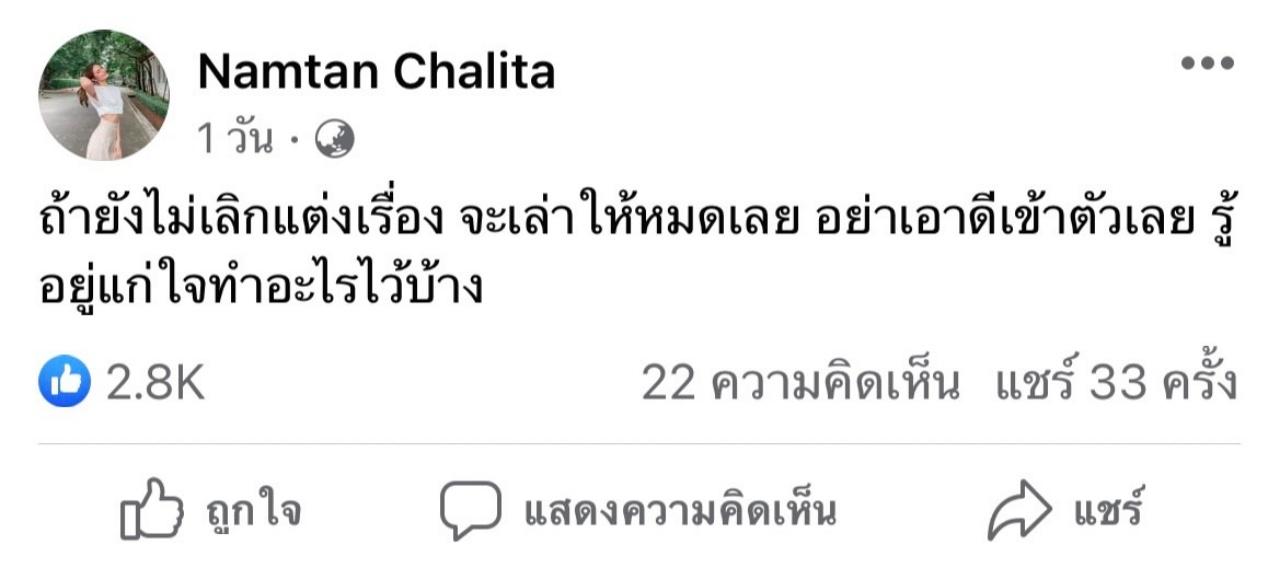ไม่รู้ว่าเกิดเรื่องอะไรขึ้น แต่ที่แน่ๆ ทำเอานางงามมีมงอย่าง น้ำตาล ชลิตา ส่วนเสน่ห์ ถึงกับไม่อยู่นิ่งอีกต่อไป เพราะล่าสุด เจ้าตัวได้ออกมาโพสต์ลอยๆ แต่ฟาดแรงผ่านทางเฟซบุ๊กส่วนตัว ด้วยข้อความที่ว่า “ถ้ายังไม่เลิกแต่งเรื่อง จะเล่าให้หมดเลย อย่าเอาดีเข้าตัวเลย รู้อยู่แก่ใจทำอะไรไว้บ้าง”