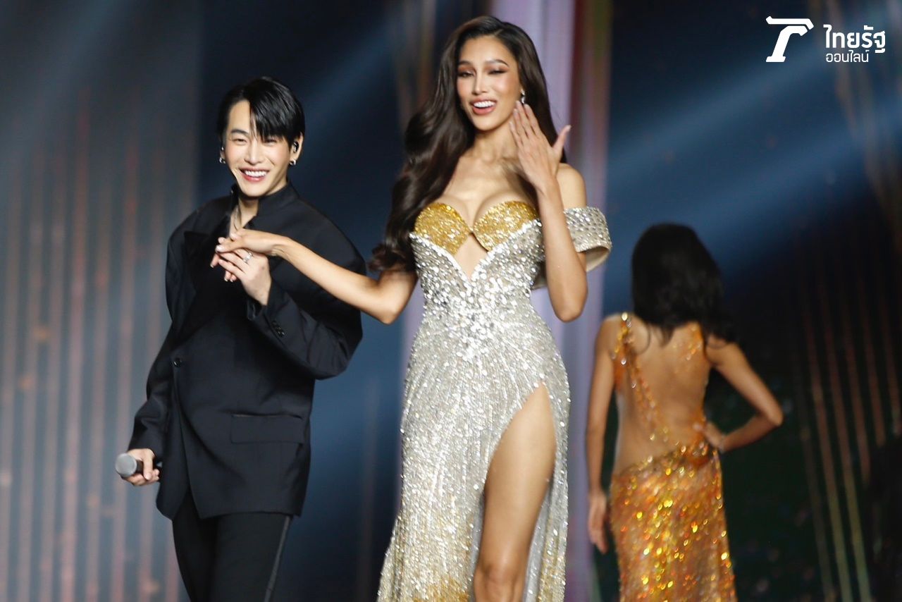 และอีกหนึ่งไฮไลต์ของการประกวด คือการเดินแบบของสาวงามผู้เข้ารอบ 12 คนสุดท้ายในรอบชุดราตรี (Evening Gown) ที่แต่ละคนมาในชุดราตรีพร้อมเครื่องเพชรจากแบรนด์ระดับโลก MOUAWAD วาดลวดลายการเดินได้สวยสง่าสะกดตามากๆ ทำเอาแฟนๆ ต่างส่งเสียงกรี๊ดสนั่น ก่อนจะเข้าสู่ช่วงโชว์พิเศษจาก เป๊ก ผลิตโชค ที่ขึ้นมาร้องเพลง ท่ามกลางสาวงามผู้เข้าประกวดที่มาร่วมเดินแบบบนเวที