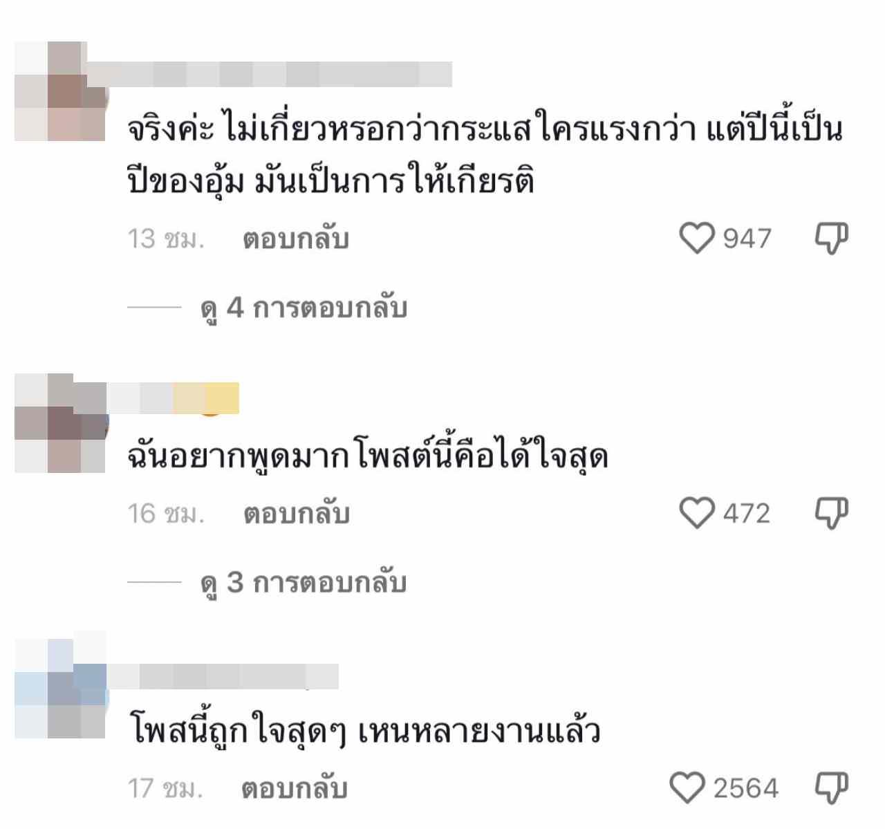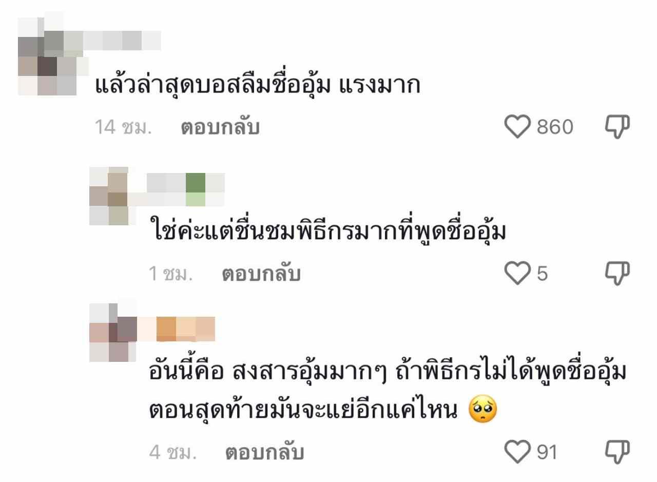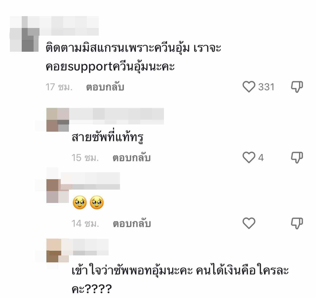 หลังจากที่คลิปนี้ถูกเผยแพร่ลงในโซเชียล ก็มีแฟนๆ นางงามเข้ามาคอมเมนต์แสดงความคิดเห็นถึงเรื่องนี้อย่างมากมาย อาทิ "จริงค่ะ ไม่เกี่ยวหรอกว่ากระแสใครแรงกว่า แต่ปีนี้เป็นปีของอุ้ม มันเป็นการให้เกียรติ, เอาจริงมันไม่ได้เกี่ยวว่าใครทำเงินได้มากกว่า แต่คือการให้เกียรติคนมงปีนี้ด้วย, เห็นด้วยครับ เห็นหลายงานแล้ว อุ้มไม่ค่อยมีบทเลย, จริง อะไรก็ อฟ หมด น่าจะให้แสงอุ้มบ้าง, แล้วล่าสุดบอสลืมอุ้มแรงมาก, อันนี้คือสงสารอุ้มมากๆ ถ้าพิธีกรไม่ได้พูดชื่ออุ้มตลอด สุดท้ายมันจะแย่อีกแค่ไหน".