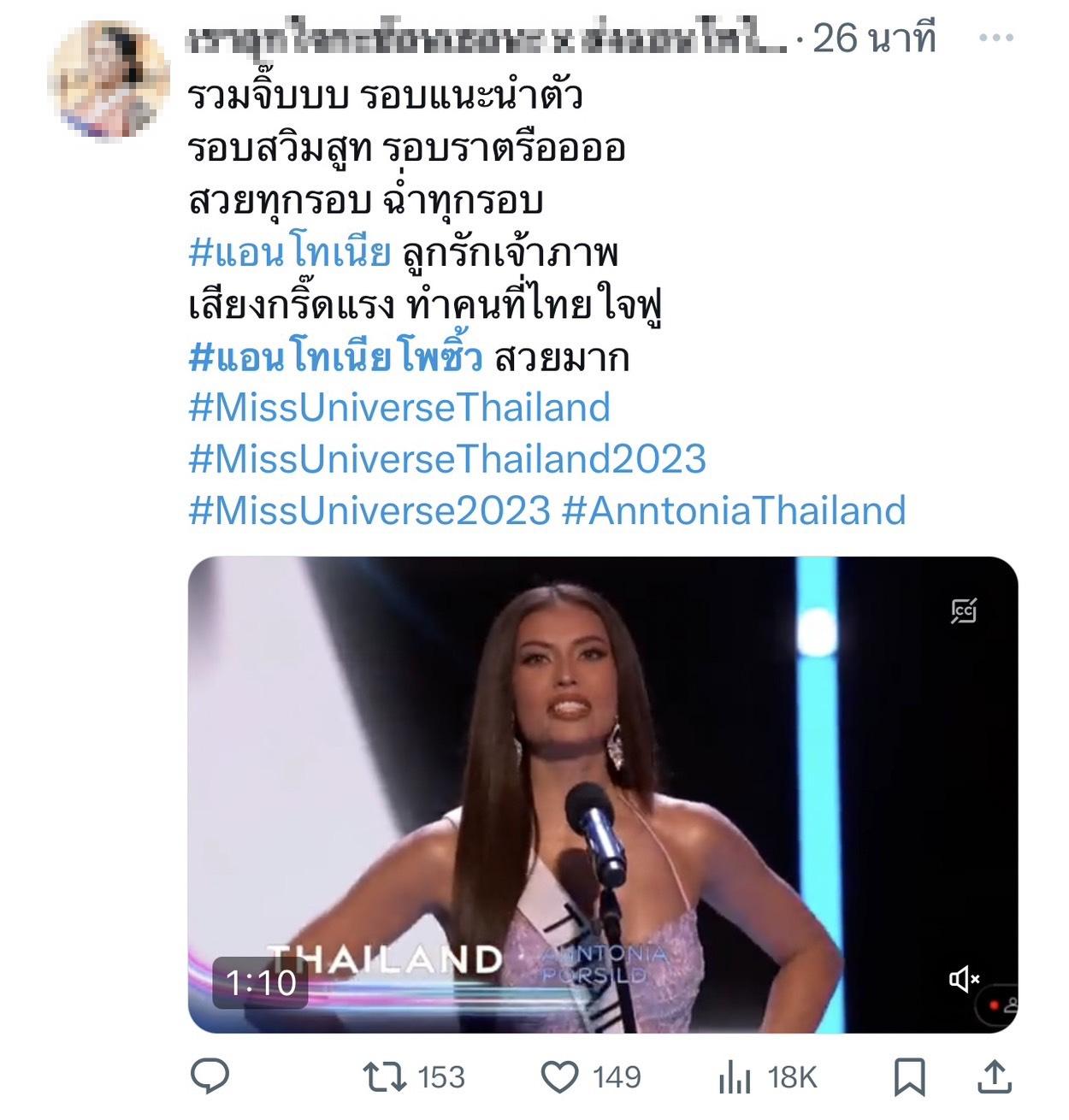 งานนี้แฟนนางงามทั่งโลกต่างชื่นชมในความสวยเก่งครบเครื่องของ แอนโทเนีย ซึ่งไม่ว่าจะปรากฏตัวในรอบไหนก็ทำได้ดี จนคนดูทั้งฮอลล์ไม่สามารถละสายตาไปจากเธอได้เลย และในโซเชียลตอนนี้ ทวิตเตอร์ หรือ X #แอนโทเนียโพซิ้ว ได้ขึ้นเทรนด์อันดับ 1 ไปเป็นที่เรียบร้อยแล้ว.