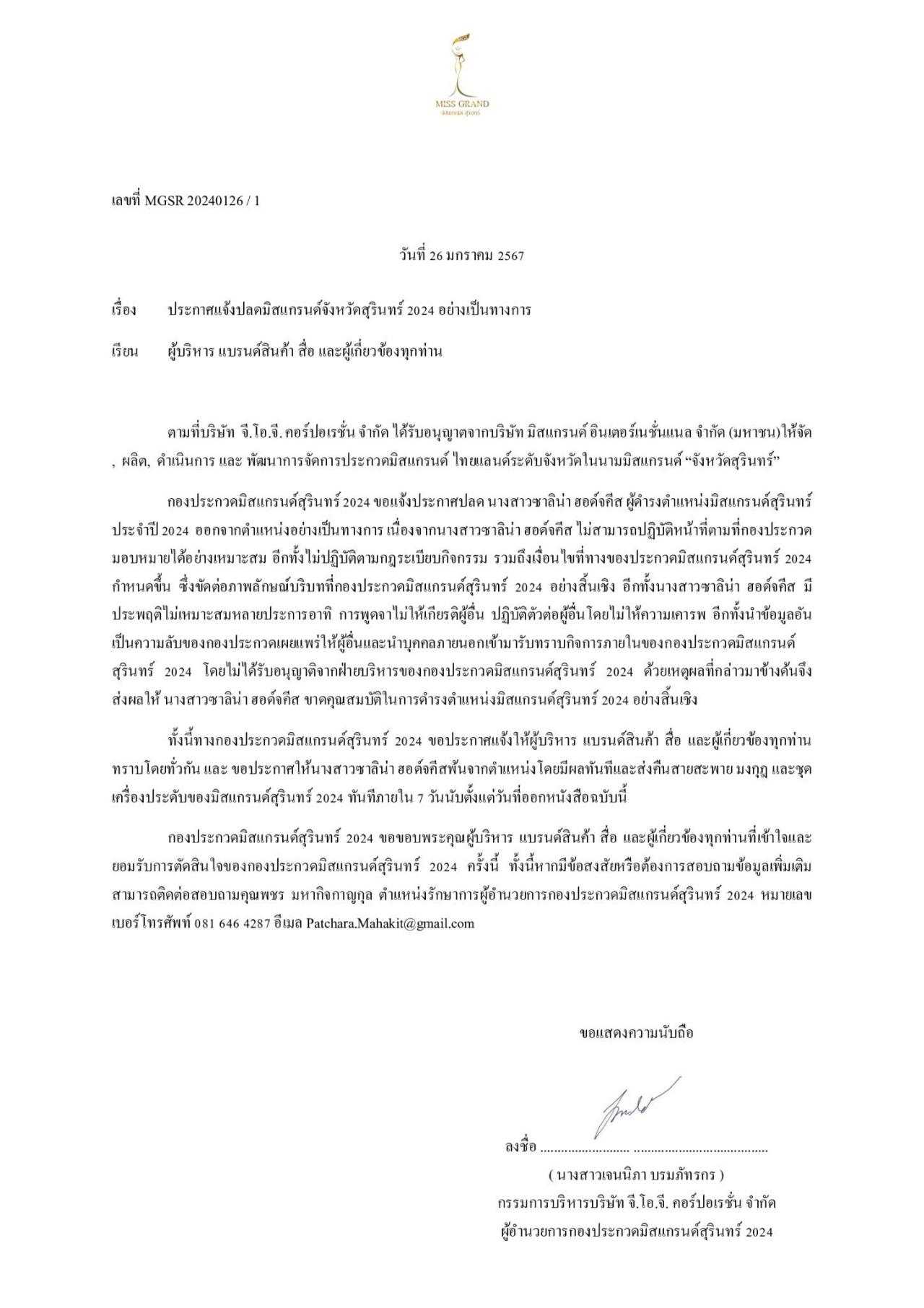 หลังจากที่กองประกวดมิสแกรนด์สุรินทร์ได้ออกประกาศ สั่งปลด ซาลิน่า ฮอด์จคีส มิสแกรนด์สุรินทร์ 2024 พร้อมเผยสาเหตุที่ปลดนางงามแบบฟ้าผ่า พร้อมสั่งให้ส่งคืนมงกุฎและสายสะพายภายใน 7 วัน