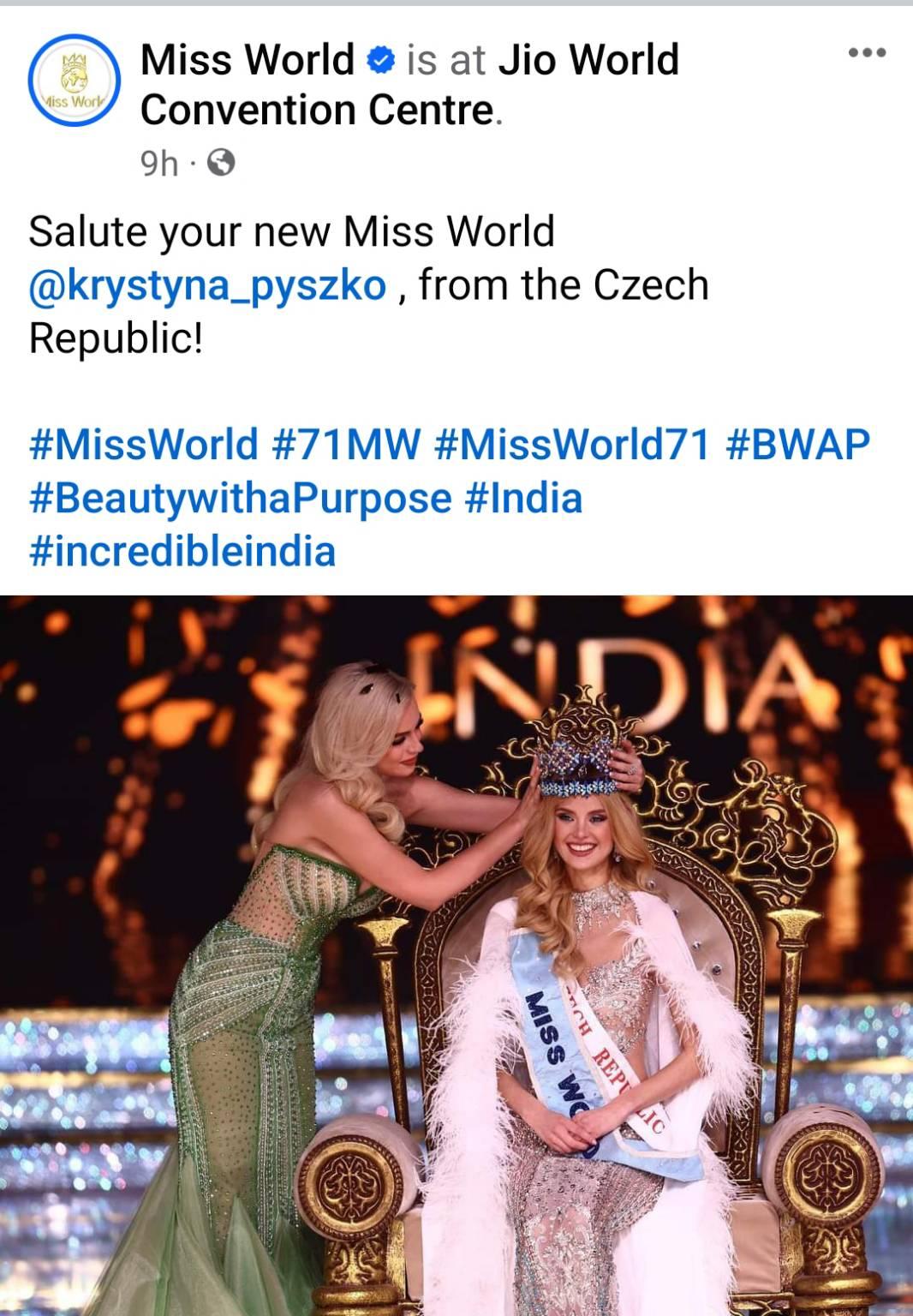 สิ้นสุดการรอคอยสำหรับการประกวด "มิสเวิลด์" (Miss World) ครั้งที่ 71 ที่จัดขึ้น ณ Jio World Convention Centre เมืองมุมไบ ประเทศอินเดีย ในคืนวันเสาร์ที่ 9 มีนาคม ที่ผ่านมา ได้สาวงามที่เพียบพร้อมมารับตำแหน่งมิสเวิลด์คนล่าสุดเป็นที่เรียบร้อยแล้วนั่นคือ Krystyna Pyszková จากสาธารณรัฐเช็ก โดยมี Yasmina Zaytoun สาวงามจากประเทศเลบานอน รับตำแหน่งรองอันดับ 1 ท่ามกลางบรรยากาศสุดประทับใจ โดยมีเพื่อนๆ สาวงามกว่า 120 ประเทศร่วมแสดงความยินดีด้วยความชื่นมื่น