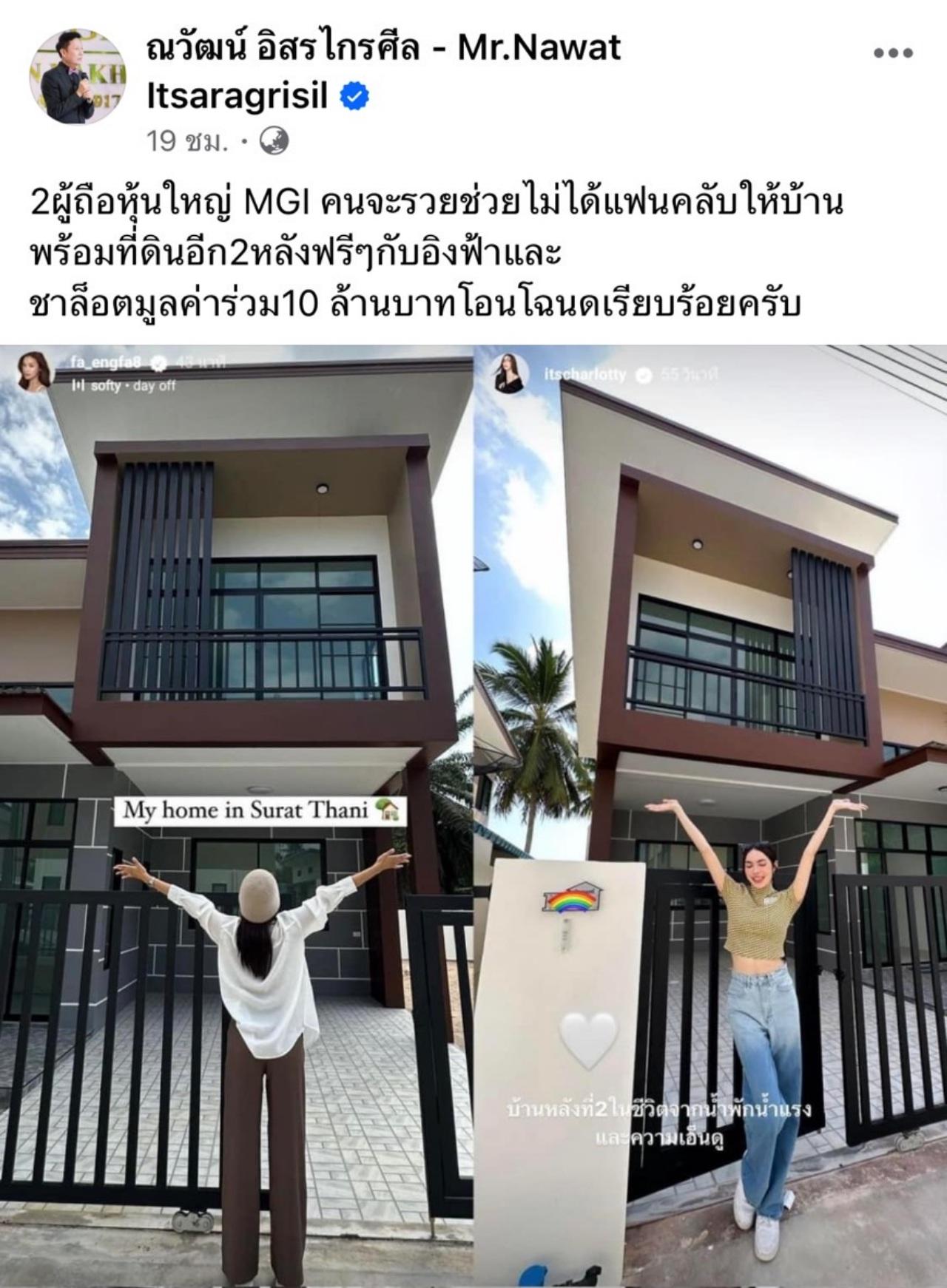 ด้าน บอสณวัฒน์ อิสรไกรศีล ก็ได้โพสต์ภาพ 2 สาวกับบ้านหลังใหม่ พร้อมเขียนแคปชั่นว่า "2 ผู้ถือหุ้นใหญ่ MGI คนจะรวยช่วยไม่ได้ แฟนคลับให้บ้านพร้อมที่ดินอีก 2 หลังฟรีๆ กับอิงฟ้าและชาล็อต มูลค่าร่วม 10 ล้านบาท โอนโฉนดเรียบร้อยครับ"
