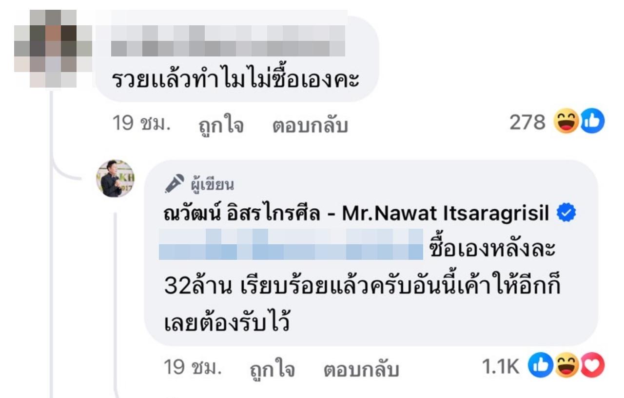 แฟนๆ ที่ติดตามเข้ามาร่วมแสดงความยินดีกันจำนวนมาก แต่งานนี้ก็มีชาวเน็ตคนหนึ่งโผล่เข้ามาถามว่า "รวยแล้วทำไมไม่ซื้อเองคะ" ด้าน บอสณวัฒน์ ก็ได้เข้ามาตอบกลับสั้นๆ แต่แซ่บว่า "ซื้อเองหลังละ 32 ล้าน เรียบร้อยแล้วครับ อันนี้เค้าให้อีกก็เลยต้องรับไว้".