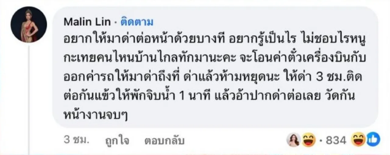 ล่าสุด หลิน ได้ตอบเมนต์พร้อมฝากถึงพี่ๆ กะเทยที่ชอบบูลลี่เธอว่า "อยากให้มาด่าต่อหน้าด้วยบางที อยากรู้เป็นไรไม่ชอบไรหนู กะเทยคนไหนบ้านไกลทักมานะคะ จะโอนค่าตั๋วเครื่องบินกับออกค่ารถให้มาด่าถึงที่ ด่าแล้วห้ามหยุดนะ ให้ด่า 3 ชม.ติดต่อกันแล้วให้พักจิบน้ำ 1 นาที แล้วอ้าปากด่าต่อเลย วัดกันหน้างานจบๆ" ซึ่งประโยคดังกล่าวของหลินถูกแชร์กันจำนวนมาก.