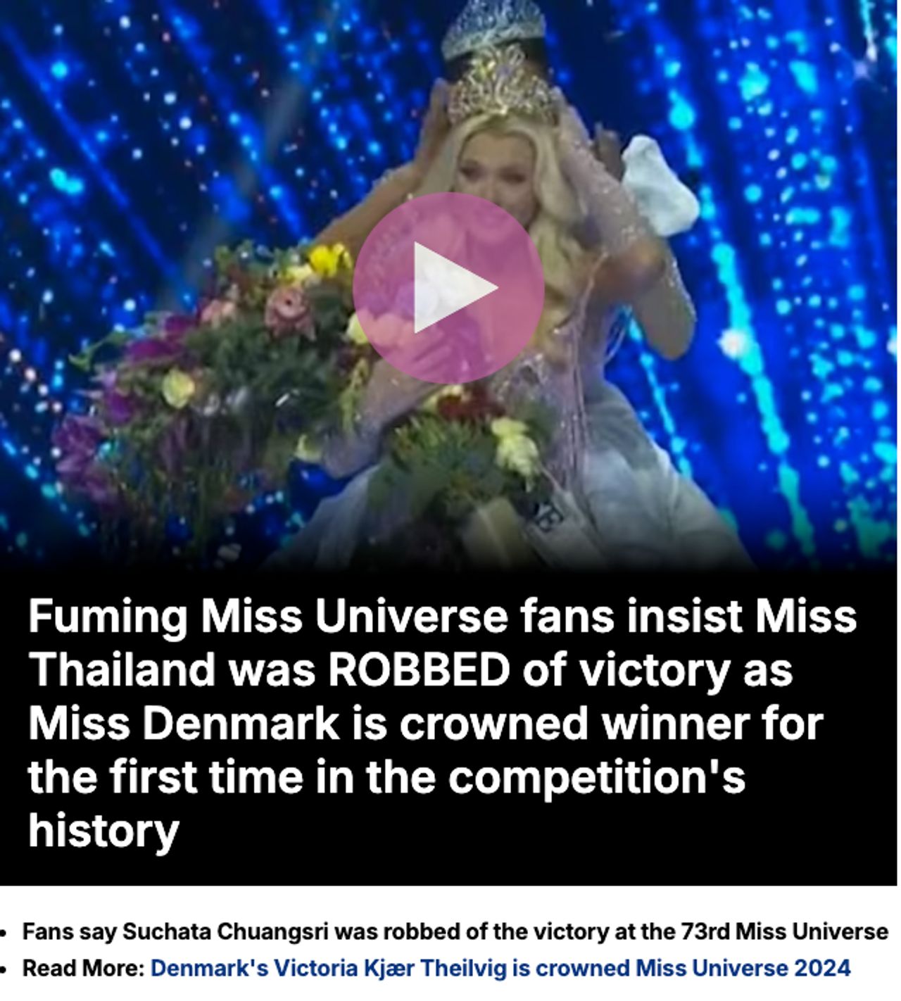 ล่าสุด สื่อยักษ์ใหญ่ของประเทศอังกฤษอย่าง Dailymail ได้ทำสกู๊ปเกี่ยวกับการประกวดมิสยูนิเวิร์ส 2024 เอาไว้ว่า (คลิกเพื่อ อ่านข่าว) หลังจากที่ผลการประกวดออกมาว่า เดนมาร์ก ได้ตำแหน่ง Miss Universe 2024 มีแฟนนางงามบางกลุ่มได้แสดงความคิดเห็นถึงเรื่องนี้ใน X เอาไว้ว่า โอปอล สุชาตา มิสยูนิเวิร์สไทยแลนด์ ถูกปล้นมง เพราะในรอบตอบคำถามโอปอลตอบได้ดีมาก แต่กลับไม่ได้รับชัยชนะจากการประกวดในครั้งนี้