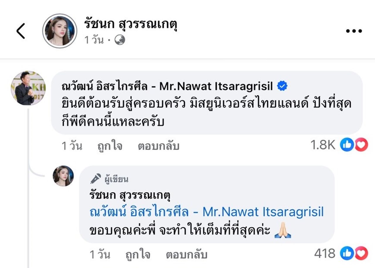 ด้าน ณวัฒน์ อิสรไกรศีล บิ๊กบอสคนใหม่ของเวทีมิสยูนิเวิร์สไทยแลนด์ ก็เข้ามาคอมเมนต์ต้อนรับ โดยบอกว่า “ยินดีต้อนรับสู่ครอบครัว มิสยูนิเวิร์สไทยแลนด์ ปังที่สุดก็พีดีคนนี้แหละครับ” ซึ่ง เจนนี่ ก็ตอบกลับว่า “ขอบคุณค่ะพี่ จะทำให้เต็มที่ที่สุดค่ะ”
