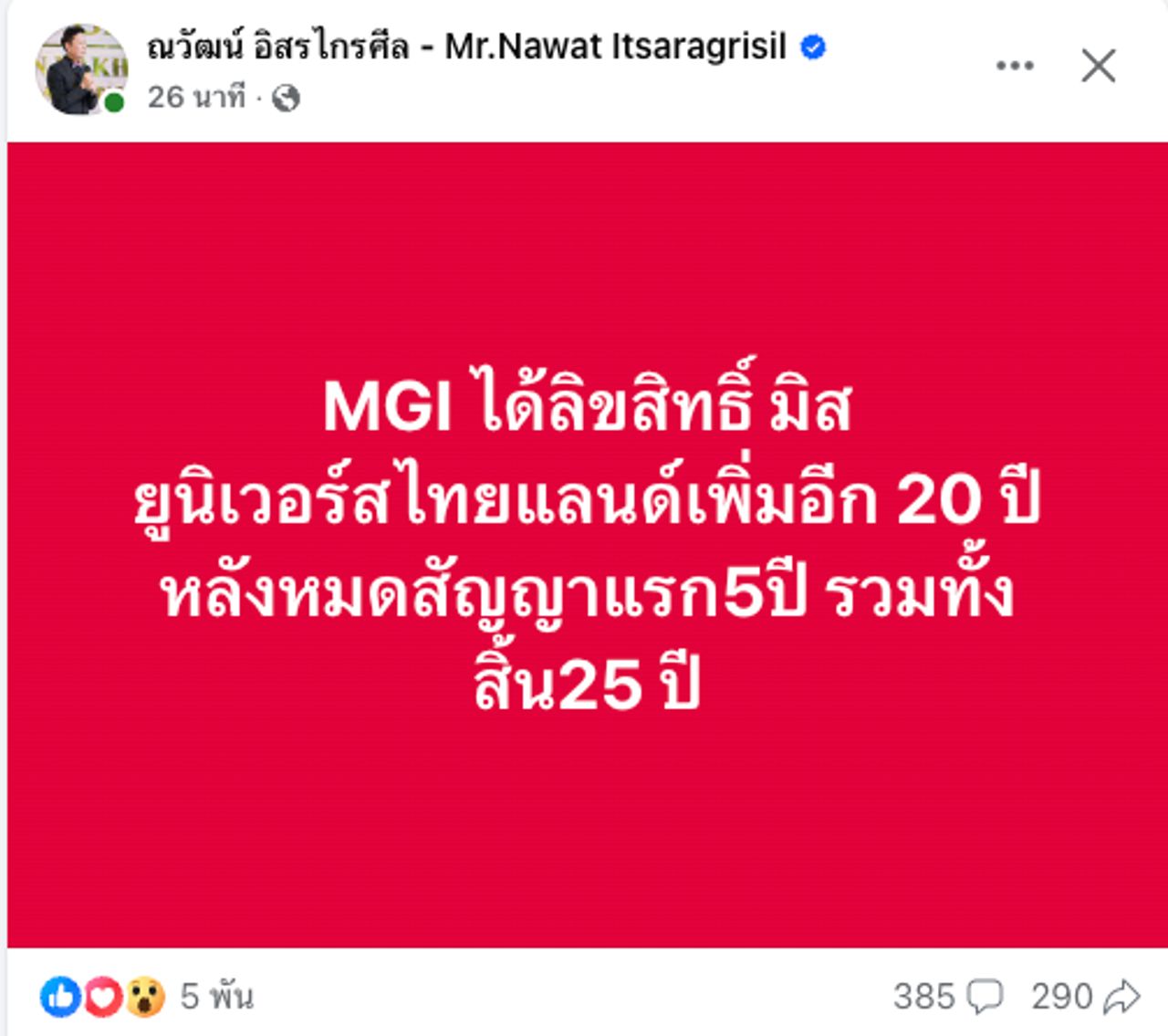 ล่าสุด ณวัฒน์ อิสรไกรศีล โพสต์แจ้งข่าวเซอร์ไพรส์แฟนๆ นางงามด้วยการประกาศว่า บริษัท มิสแกรนด์ อินเตอร์เนชั่นแนล จำกัด (มหาชน) หรือ MGI จะได้ถือลิขสิทธิ์ของ มิสยูนิเวิร์สไทยแลนด์ (Miss Universe Thailand) เพิ่มอีก 20 ปี รวมทั้งหมด 25 ปี โดยบอกว่า “MGI ได้ลิขสิทธิ์มิสยูนิเวิร์สไทยแลนด์เพิ่มอีก 20 ปี หลังหมดสัญญาแรก 5 ปี รวมทั้งสิ้น 25 ปี”