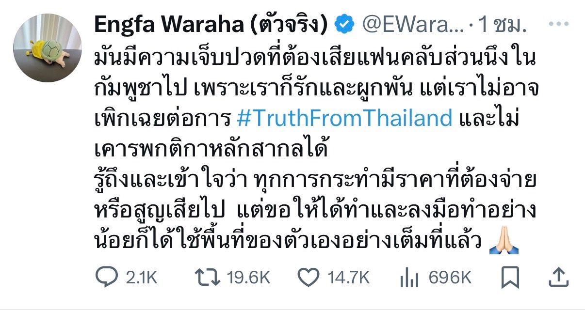 ทำเอา อิงฟ้า วราหะ นางงามมหาชนจากเวทีมิสแกรนด์ ต้องออกมาเคลื่อนไหว หลังเกิดความตึงเครียดตามแนวชายแดนไทย-กัมพูชา ซึ่งอิงฟ้ายอมเจ็บปวดที่ต้องเสียแฟนคลับส่วนนึงในกัมพูชาไป และติด #TruthFromThailand ซึ่งอิงฟ้าเคลื่อนไหวผ่านทาง X มีข้อความว่า