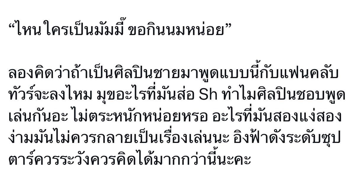 "ลองคิดว่าถ้าเป็นศิลปินชายมาพูดแบบนี้กับแฟนคลับทัวร์จะลงไหม มุกอะไรที่มันส่อ Sh ทำไมศิลปินชอบพูดเล่นกันอะ ไม่ตระหนักหน่อยเหรอ อะไรที่มันสองแง่สองง่ามมันไม่ควรกลายเป็นเรื่องเล่นนะ อิงฟ้าดังระดับซุปตาร์ควรระวังควรคิดได้มากกว่านี้นะคะ"