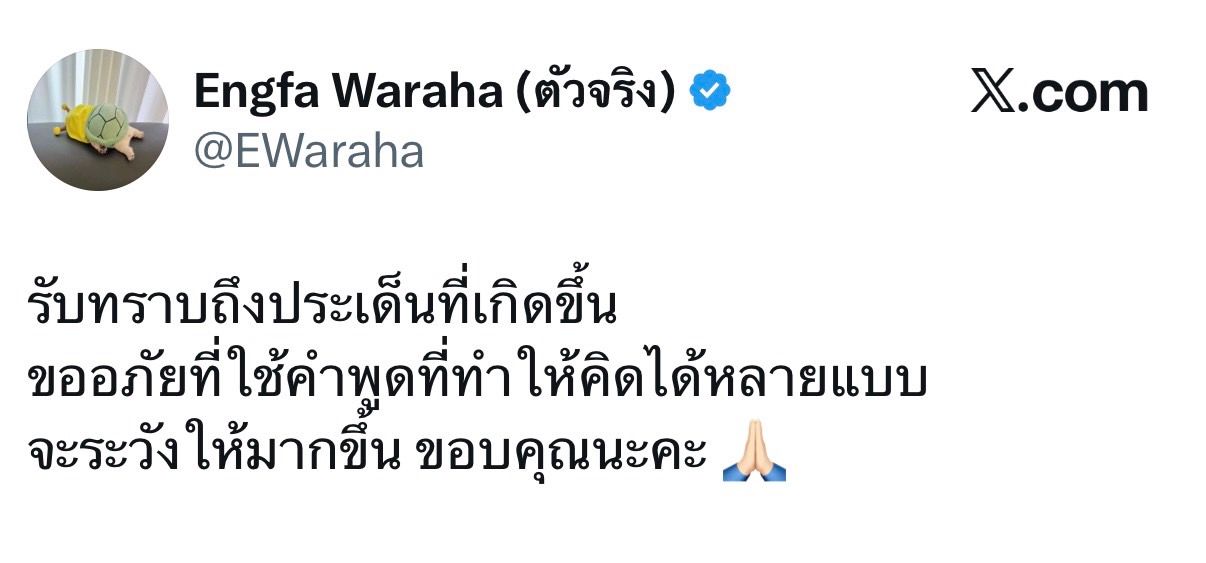 หลังจากที่ถูกคนติติงเรื่องนี้ อิงฟ้าก็ได้โพสต์ข้อความลงใน X เพื่อขอโทษกับเหตุการณ์ที่เกิดขึ้นเอาไว้ว่า "รับทราบถึงประเด็นที่เกิดขึ้น ขออภัยที่ใช้คำพูดที่ทำให้คิดได้หลายแบบ จะระวังให้มากขึ้น ขอบคุณนะคะ"