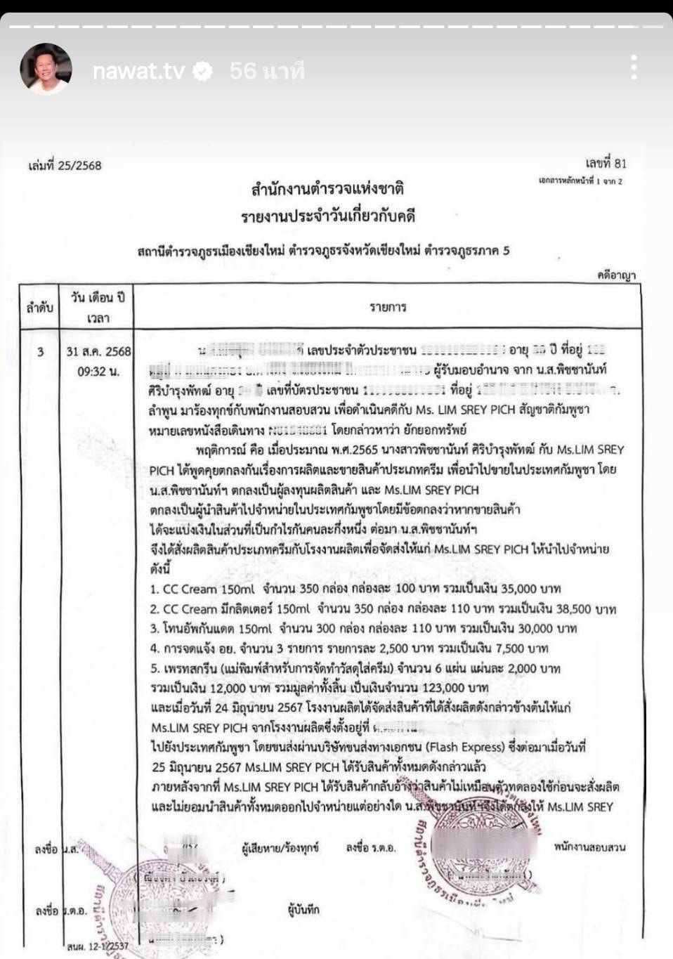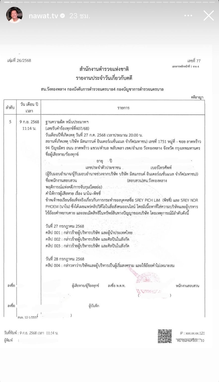 ในขณะที่บอสณวัฒน์ก็ได้โพสต์ไอจีสตอรี่เป็นภาพใบแจ้งความดำเนินคดีที่มาจากคู่กรณีของพิชชี่ รวมไปถึงโพสต์ภาพใบแจ้งความของทาง MGI ที่เตรียมฟ้อง พิชชี่-นาโน ด้วย