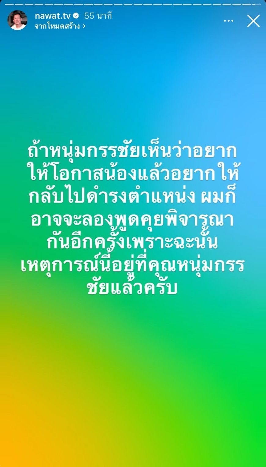 ล่าสุด ณวัฒน์ อิสรไกรศีล บิ๊กบอสเวทีมิสแกรนด์ฯ ก็ได้โพสต์ข้อความลงในไอจีสตอรี่สีเขียว มีข้อความว่า “ถ้าหนุ่ม กรรชัย เห็นว่าอยากให้โอกาสน้อง แล้วอยากให้กลับไปดำรงตำแหน่ง ผมก็อาจจะลองพูดคุยพิจารณากันอีกครั้ง เพราะฉะนั้นเหตุการณ์นี้อยู่ที่คุณหนุ่ม กรรชัย แล้วครับ”