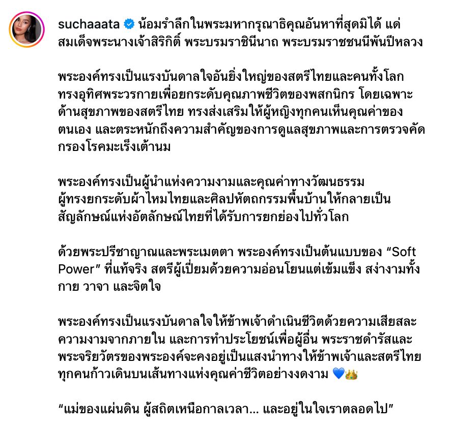พระองค์ทรงเป็นแรงบันดาลใจให้ข้าพเจ้าดำเนินชีวิตด้วยความเสียสละ ความงามจากภายใน และการทำประโยชน์เพื่อผู้อื่น พระราชดำรัสและพระจริยวัตรของพระองค์จะคงอยู่เป็นแสงนำทางให้ข้าพเจ้าและสตรีไทยทุกคนก้าวเดินบนเส้นทางแห่งคุณค่าชีวิตอย่างงดงาม"