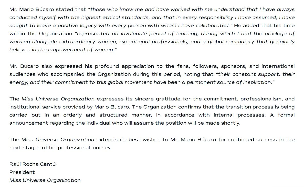 องค์กร Miss Universe ขอแสดงความขอบคุณอย่างจริงใจต่อความทุ่มเท ความเป็นมืออาชีพ และการทำงานรับใช้ในระดับสถาบันของนายมาริโอ บูคาโร พร้อมยืนยันว่ากระบวนการเปลี่ยนผ่านตำแหน่งกำลังดำเนินไปอย่างเป็นระบบและเป็นไปตามขั้นตอนภายในองค์กร ทั้งนี้ จะมีการประกาศอย่างเป็นทางการเกี่ยวกับผู้ที่จะเข้ารับตำแหน่งดังกล่าวในเร็วๆ นี้