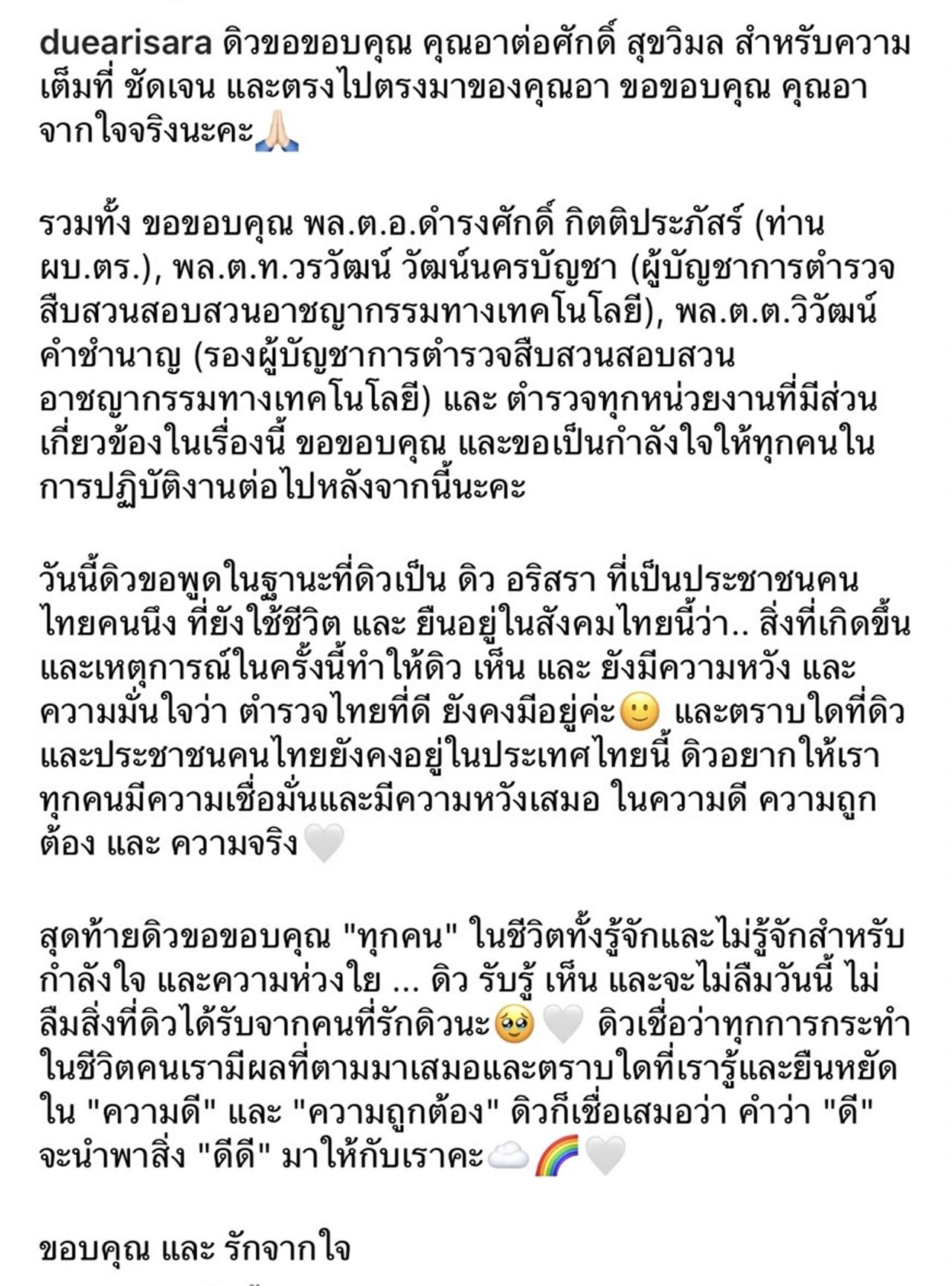 วันนี้ดิวขอพูดในฐานะที่ดิวเป็น ดิว อริสรา ที่เป็นประชาชนคนไทยคนนึง ที่ยังใช้ชีวิต และ ยืนอยู่ในสังคมไทยนี้ว่า.. สิ่งที่เกิดขึ้นและเหตุการณ์ในครั้งนี้ทำให้ดิว เห็น และ ยังมีความหวัง และความมั่นใจว่า ตำรวจไทยที่ดี ยังคงมีอยู่ค่ะ และตราบใดที่ดิวและประชาชนคนไทยยังคงอยู่ในประเทศไทยนี้ ดิวอยากให้เราทุกคนมีความเชื่อมั่นและมีความหวังเสมอ ในความดี ความถูกต้อง และ ความจริง