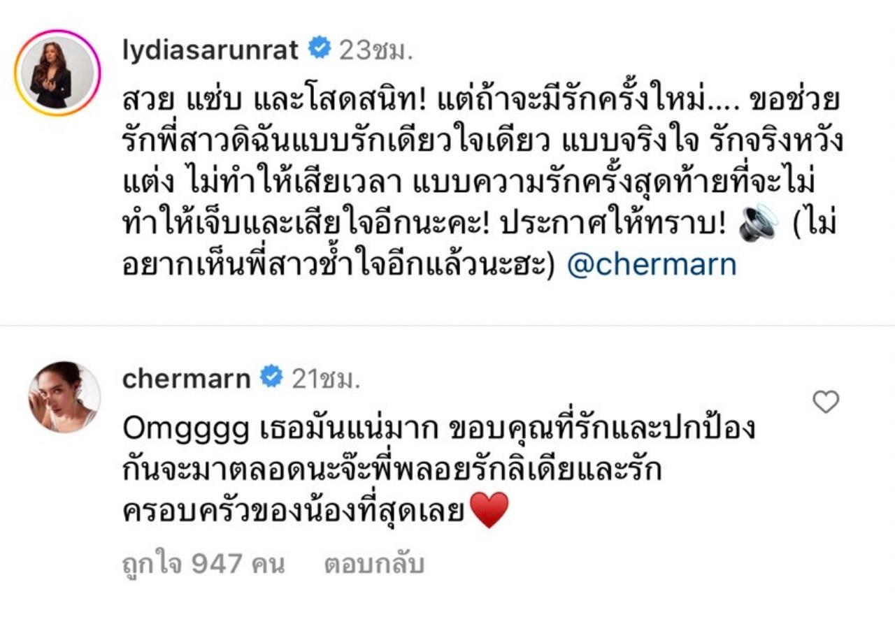 ก่อนที่ล่าสุดน้องสาวสุดที่เลิฟอย่าง ลีเดีย ศรัณย์รัชต์ ได้ออกมาโพสต์ข้อความแบบประกาศชัดเจนแทนพี่สาวไปเลยว่า "สวย แซ่บ และโสดสนิท! แต่ถ้าจะมีรักครั้งใหม่…. ขอช่วยรักพี่สาวดิฉันแบบรักเดียวใจเดียว แบบจริงใจ รักจริงหวังแต่ง ไม่ทำให้เสียเวลา แบบความรักครั้งสุดท้ายที่จะไม่ทำให้เจ็บและเสียใจอีกนะคะ! ประกาศให้ทราบ! (ไม่อยากเห็นพี่สาวช้ำใจอีกแล้วนะฮะ) @chermarn" ก่อนที่ พลอย จะเข้ามาคอมเมนต์ว่า "Omgggg เธอมันแน่มาก ขอบคุณที่รักและปกป้องกันจะมาตลอดนะจ๊ะพี่พลอยรักลิเดียและรักครอบครัวของน้องที่สุดเลย"