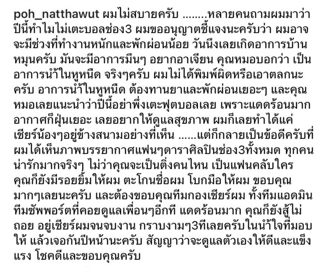 "ผมไม่สบายครับ หลายคนถามผมมาว่า ปีนี้ทำไมไม่เตะบอลช่อง 3 ผมขออนุญาตชี้แจงนะครับว่า ผมอาจจะมีช่วงที่ทำงานหนักและพักผ่อนน้อย วันนึงเลยเกิดอาการบ้านหมุนครับ มันจะมีอาการมึนๆ อยากอาเจียน คุณหมอบอกว่า เป็นอาการน้ำในหูหนืด จริงๆ ครับ ผมไม่ได้พิมพ์ผิดหรือเอาตลกนะครับ