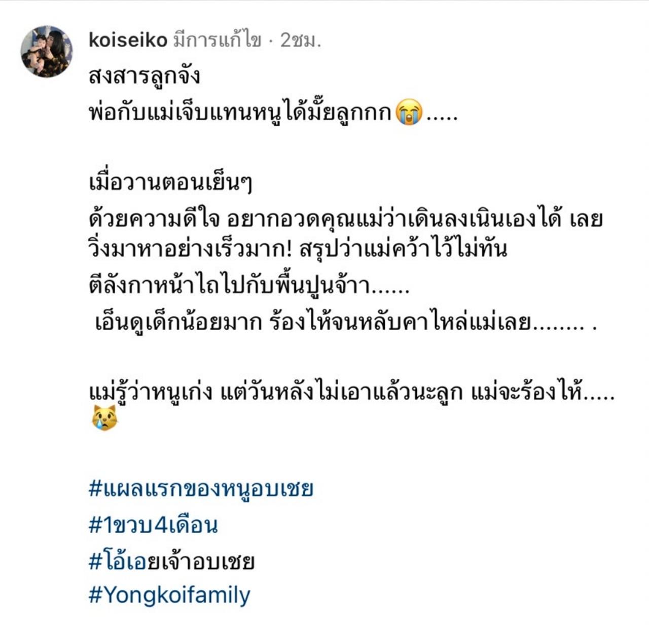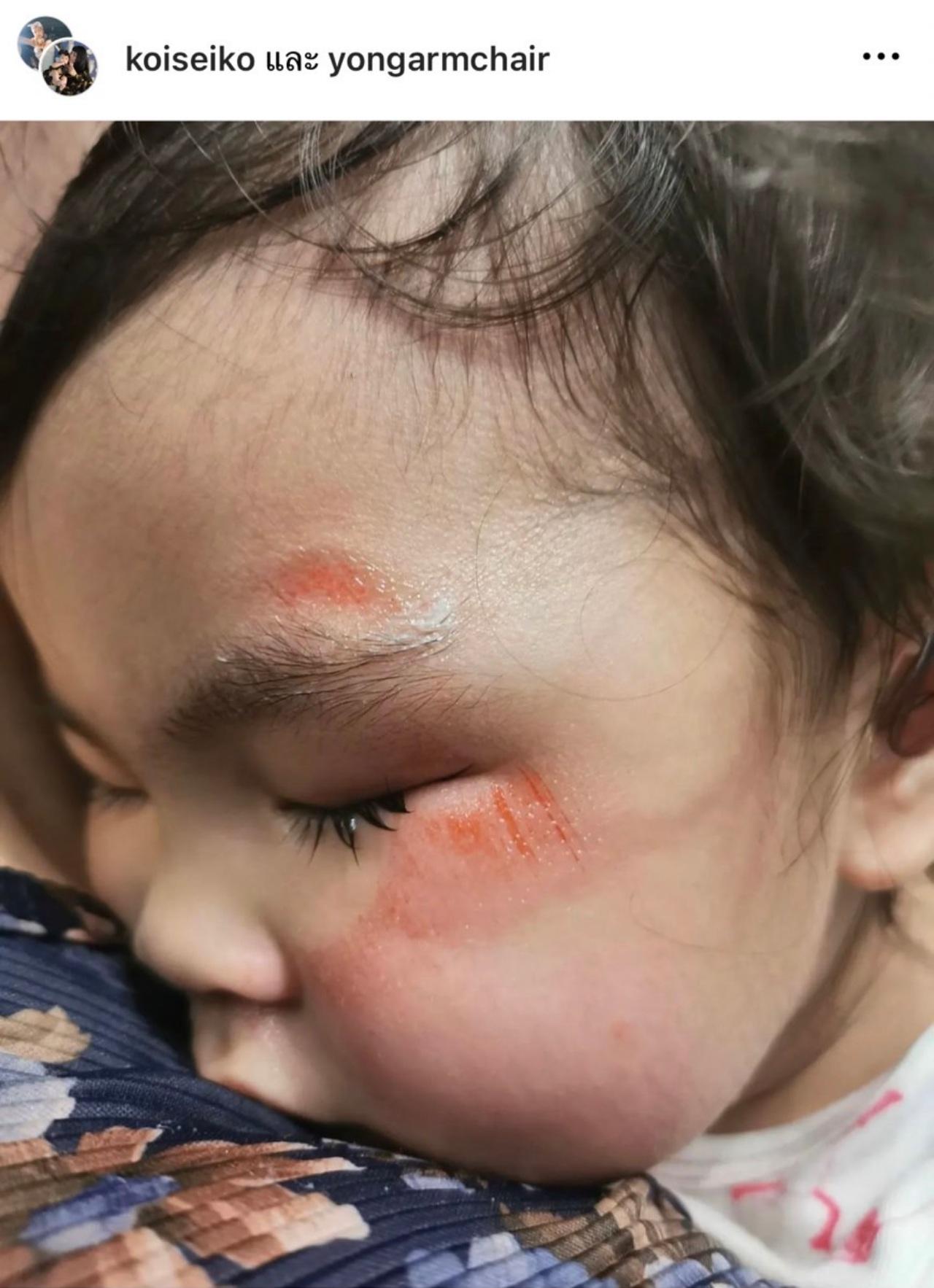 ซึ่ง ก้อย ได้โพสต์ภาพรอยแผลของลูกสาว พร้อมเขียนแคปชั่นว่า "สงสารลูกจัง พ่อกับแม่เจ็บแทนหนูได้มั๊ยลูกกก เมื่อวานตอนเย็นๆ ด้วยความดีใจ อยากอวดคุณแม่ว่าเดินลงเนินเองได้ เลยวิ่งมาหาอย่างเร็วมาก! สรุปว่าแม่คว้าไว้ไม่ทัน ตีลังกาหน้าไถไปกับพื้นปูนจ้าา เอ็นดูเด็กน้อยมาก ร้องไห้จนหลับคาไหล่แม่เลย แม่รู้ว่าหนูเก่ง แต่วันหลังไม่เอาแล้วนะลูก แม่จะร้องไห้ #แผลแรกของหนูอบเชย"